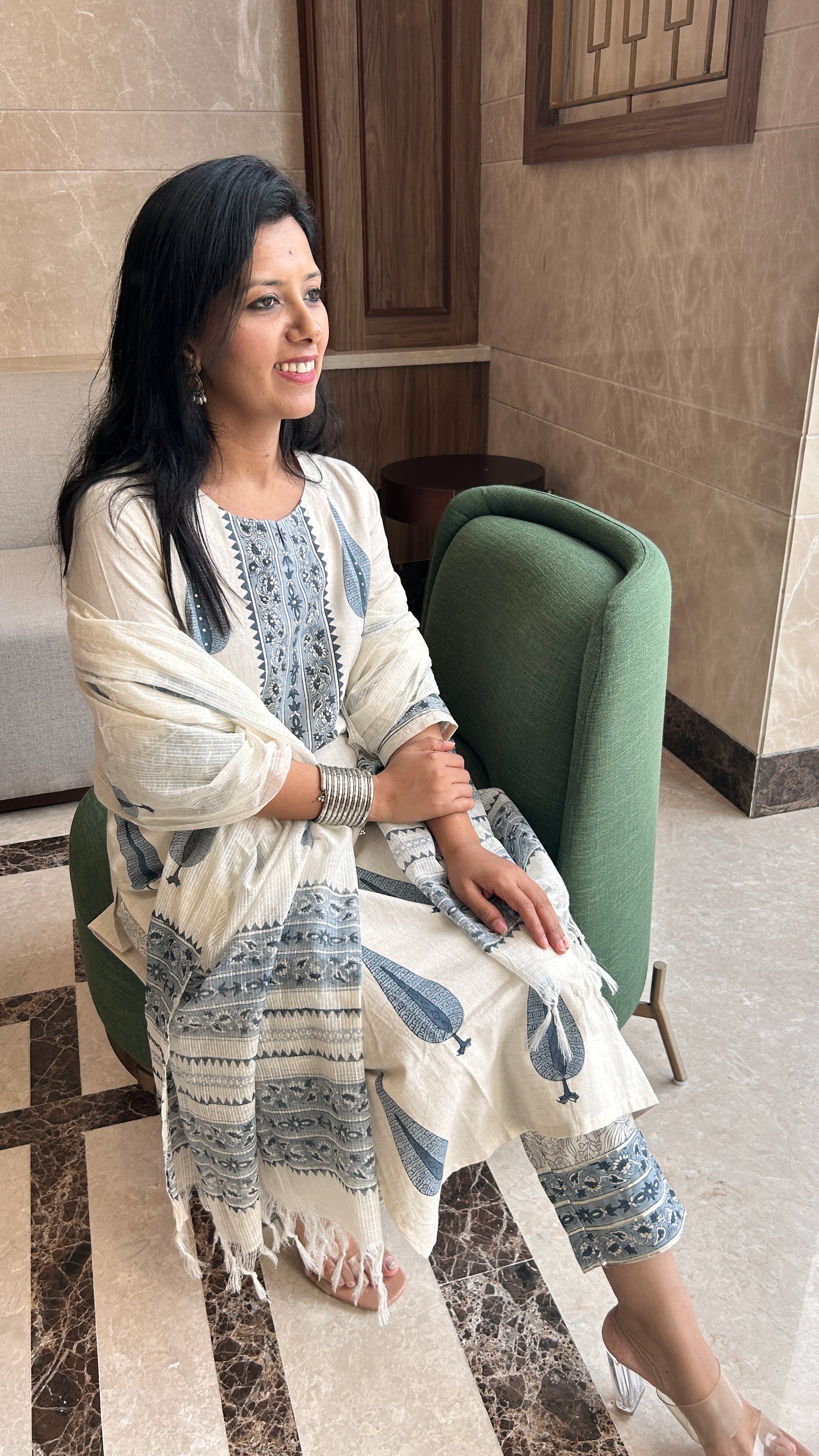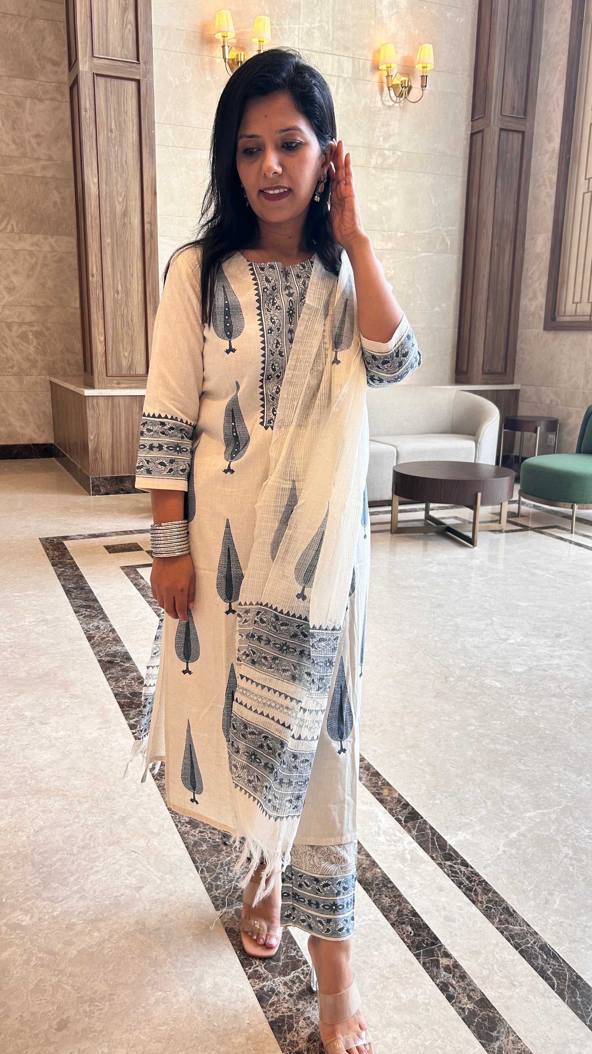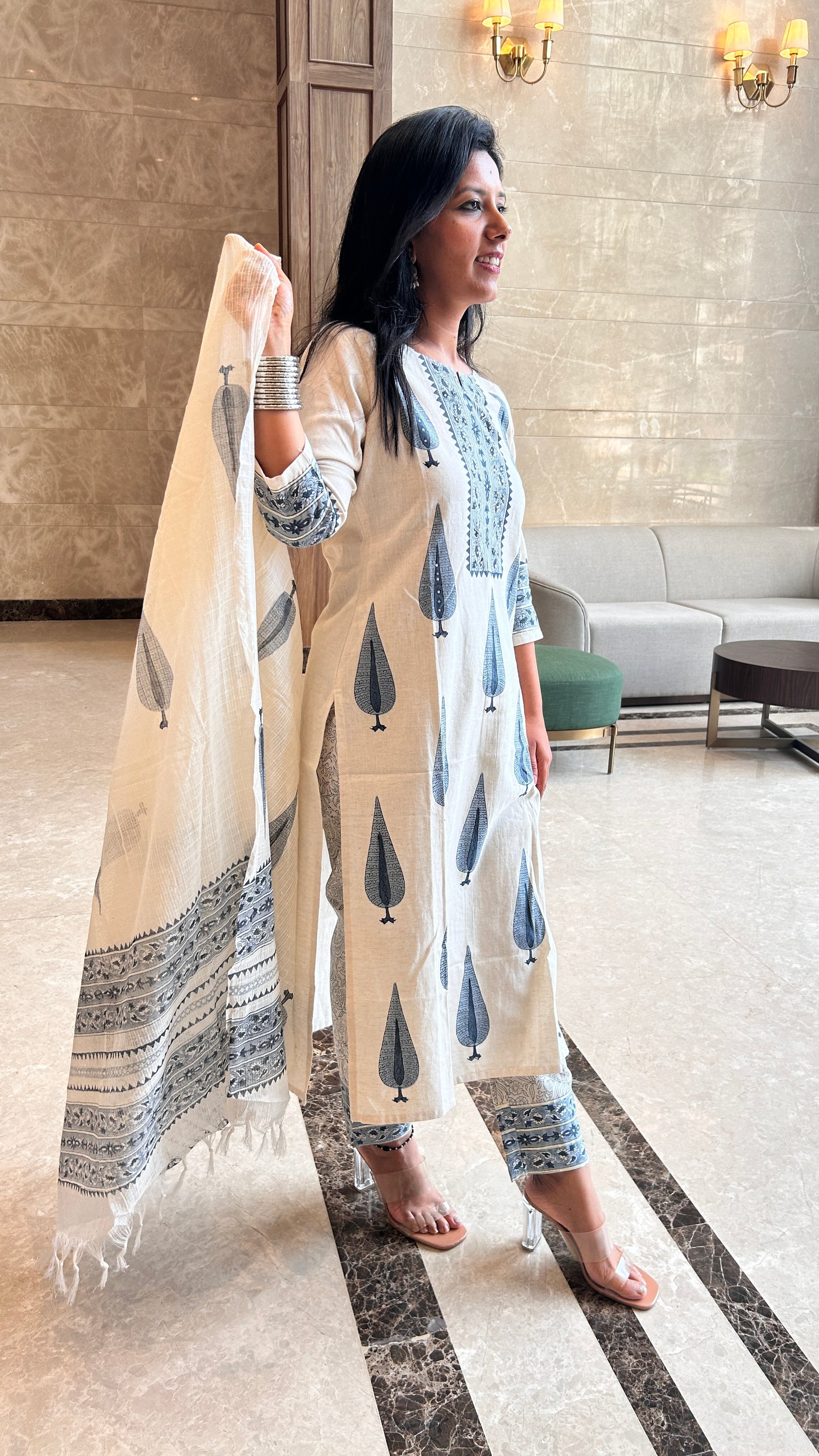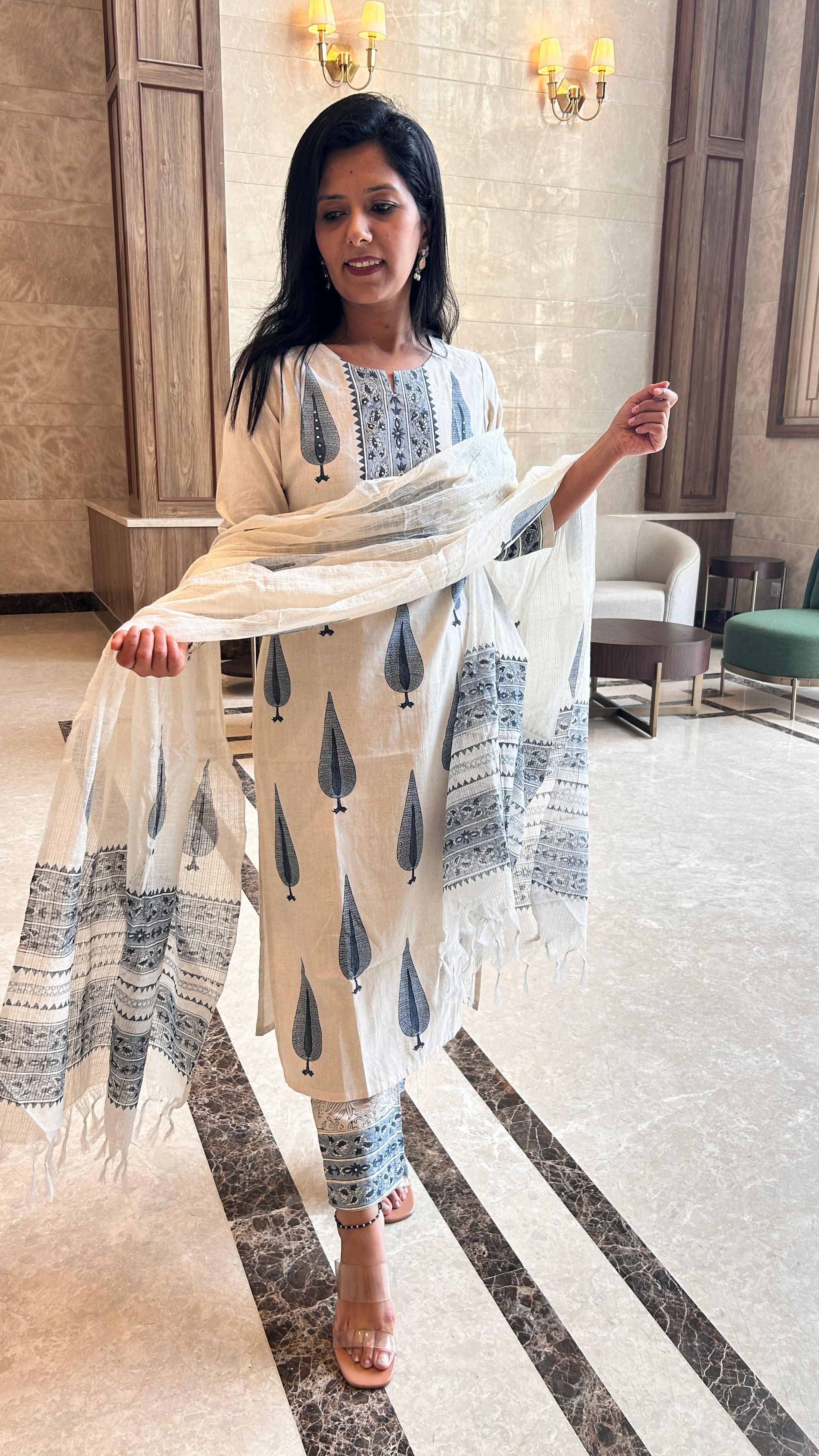 This beautiful off-white cotton suit is adorned with delicate block prints in soothing hues of blue, capturing a perfect blend of tradition and freshness. The soft cotton fabric ensures all-day comfort, while the intricate patterns bring an artisanal charm to the ensemble. Light and breezy, this suit is ideal for any occasion, from casual outings to festive gatherings, offering a graceful yet relaxed elegance. Perfect for those who appreciate subtle sophistication and the beauty of handcrafted details.