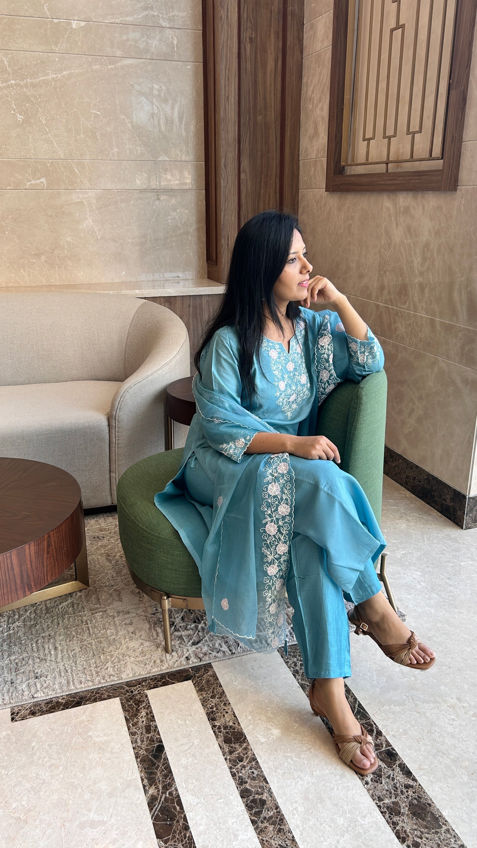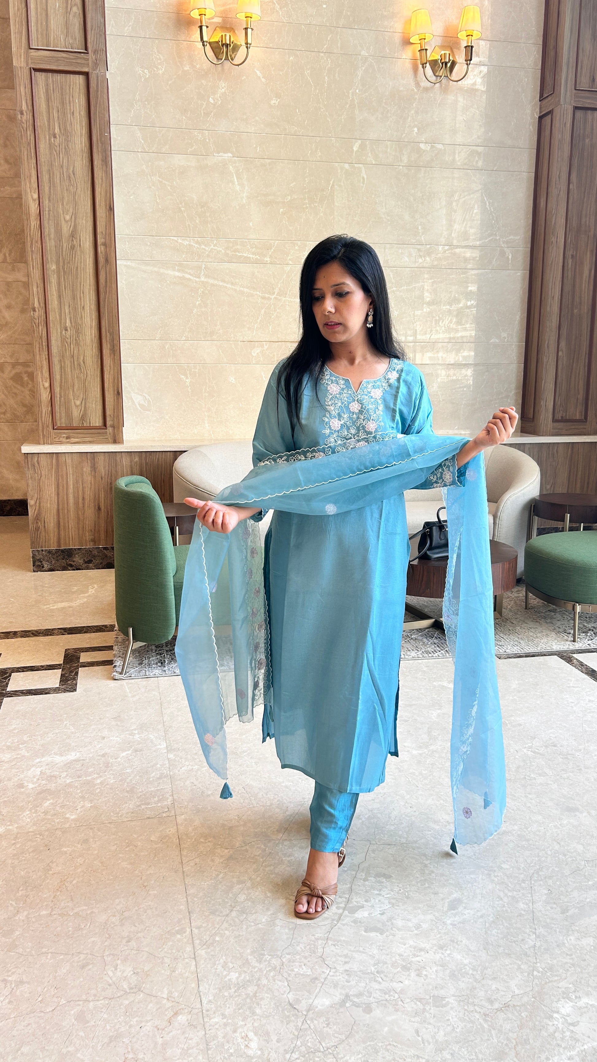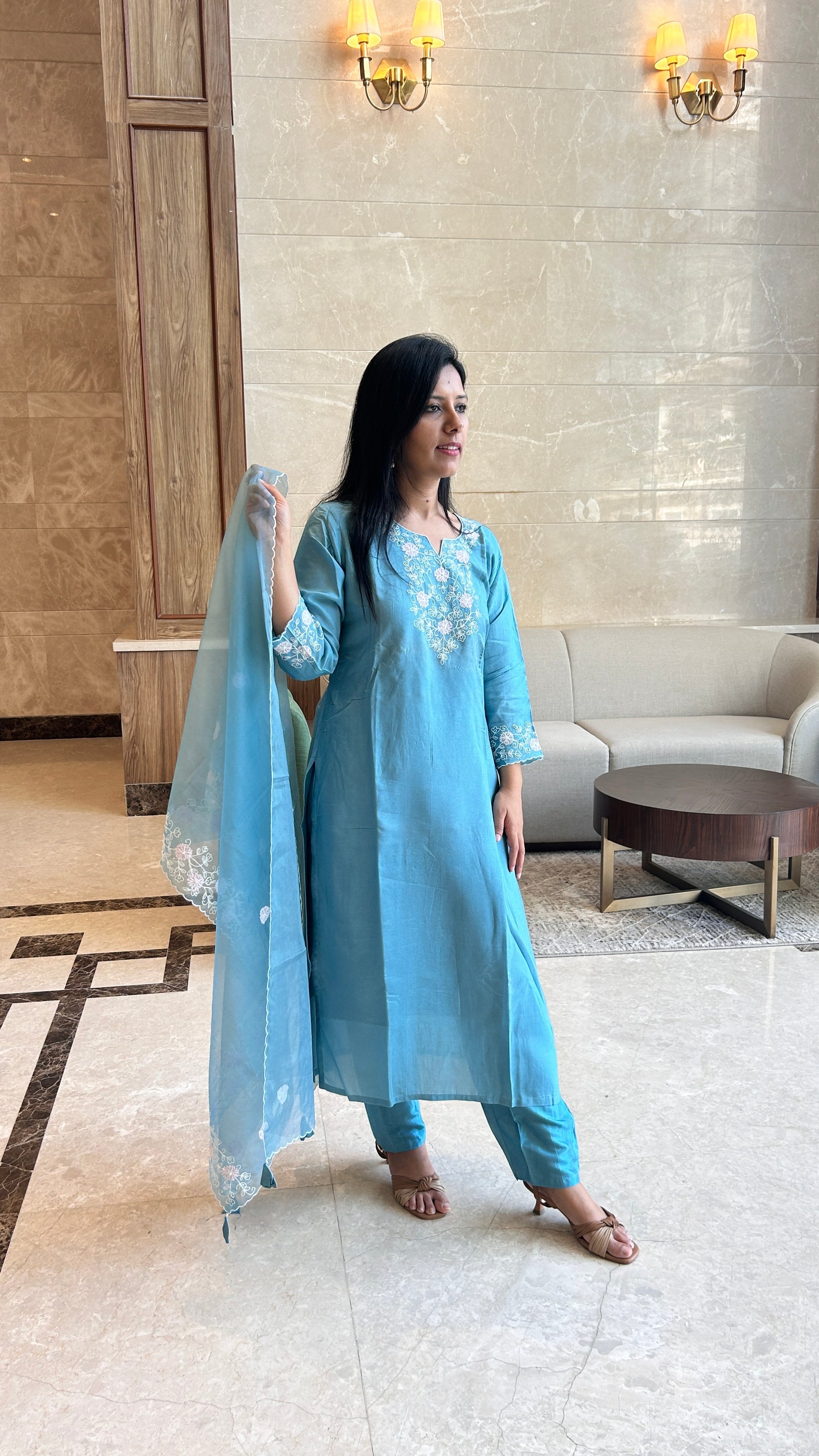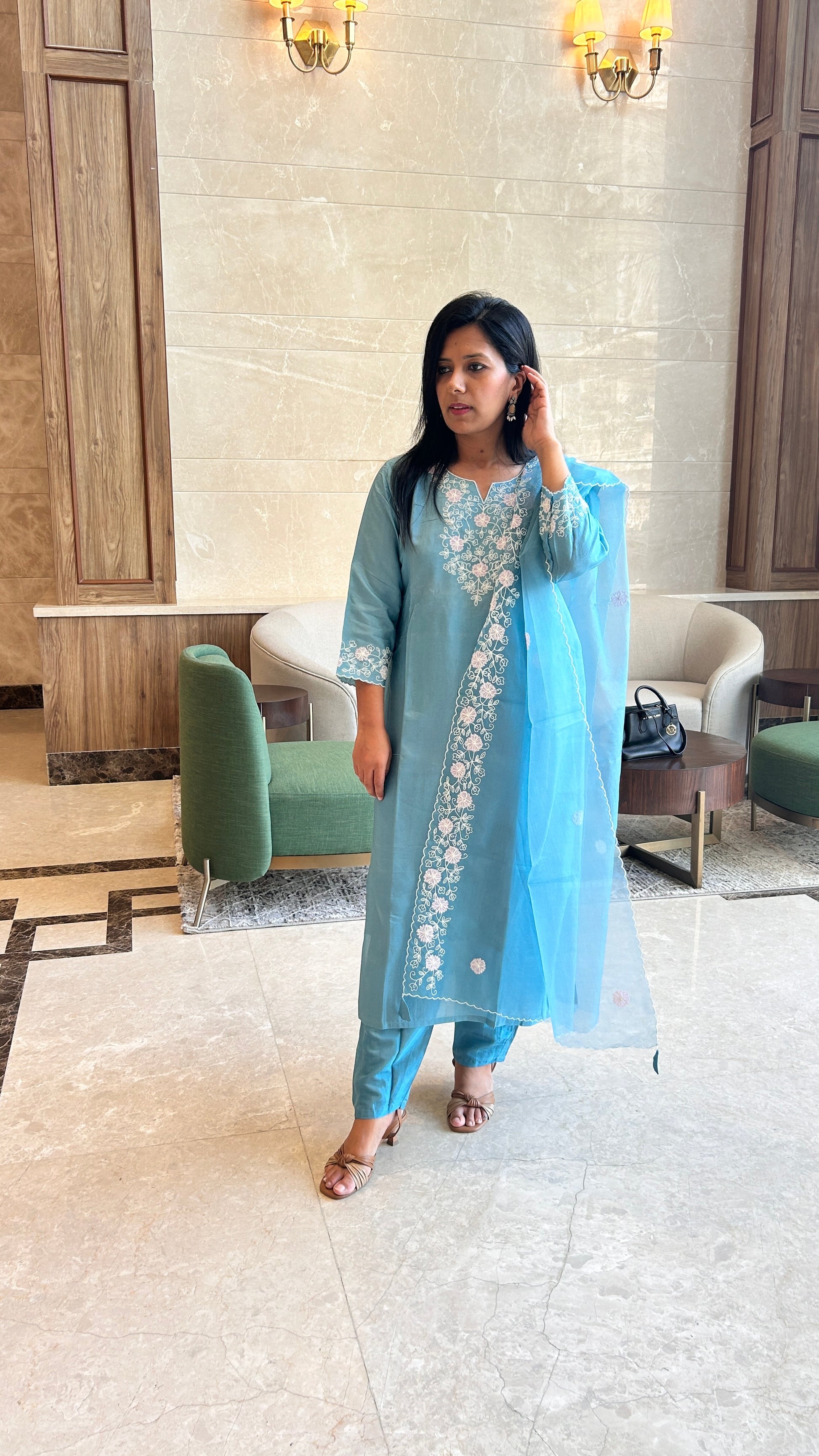 Grace meets serenity in this powder blue suit, adorned with delicate embroidery. The airy organza dupatta adds a touch of ethereal charm, making it perfect for any occasion.