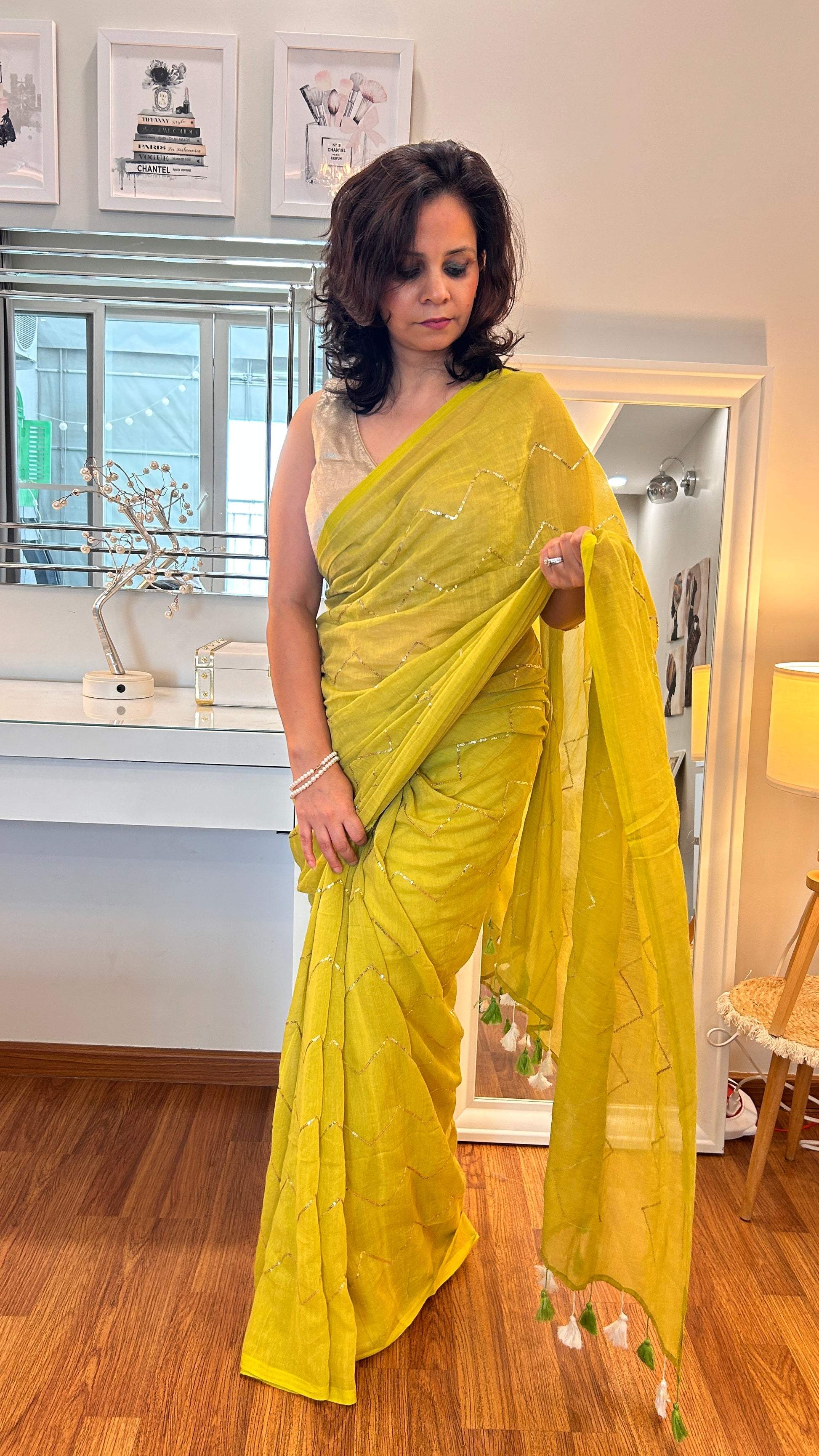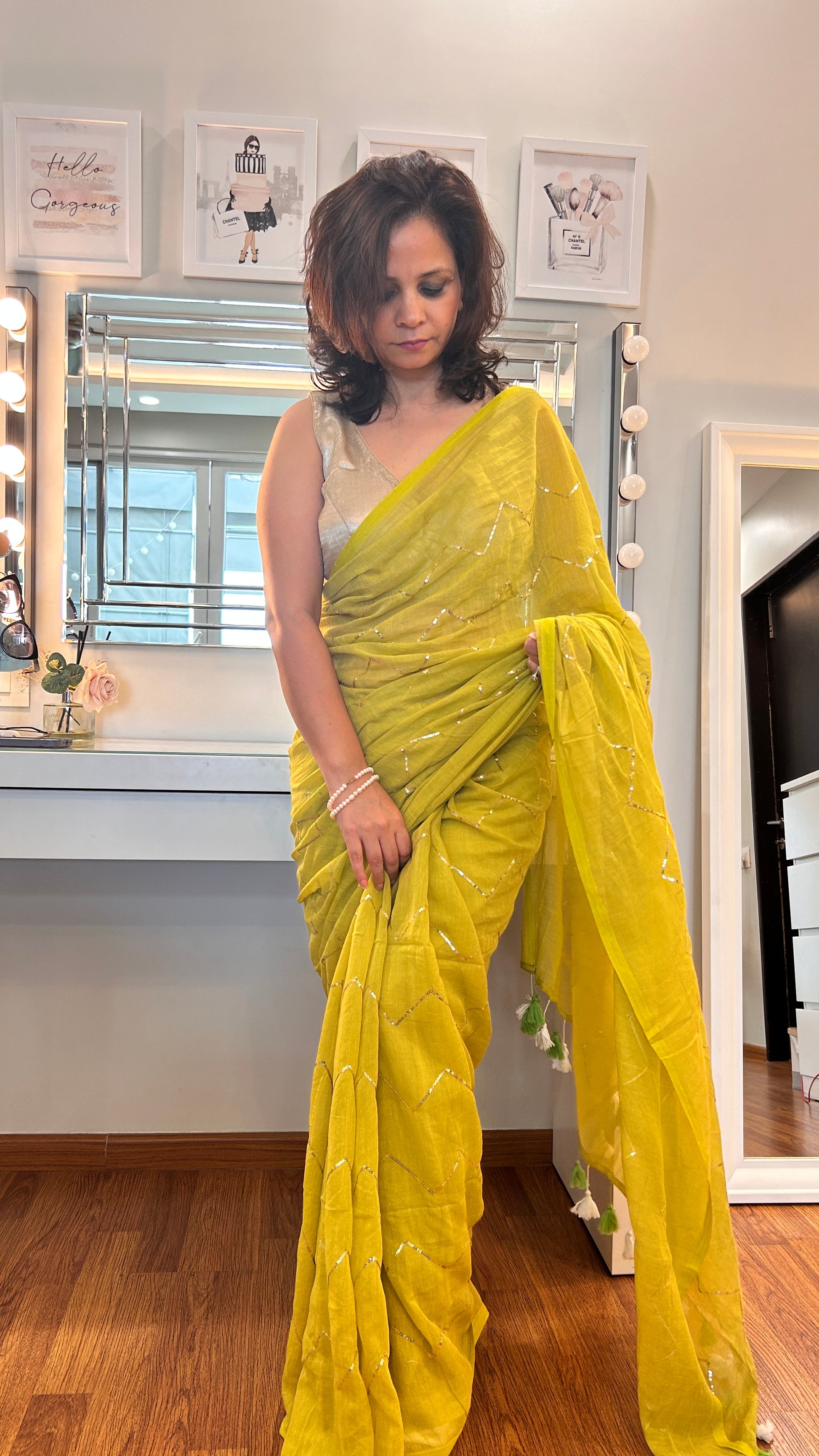 Discover elegance with our Lime Radiance Saree in rich green, featuring intricate sequin work that sparkles beautifully. This saree combines nature's charm with glamour, ensuring you stand out effortlessly. Pair it with statement jewelery to elevate your look!
