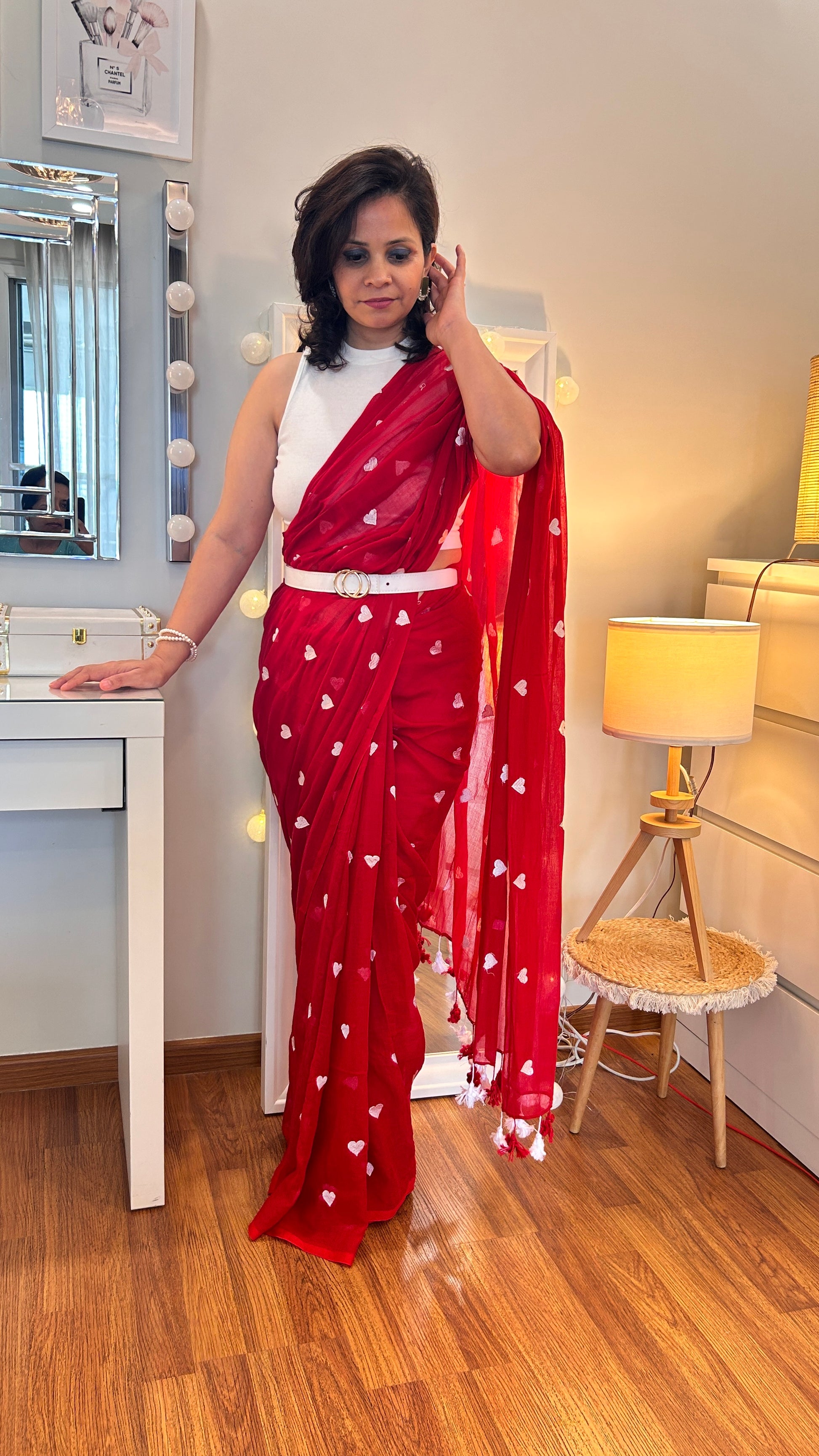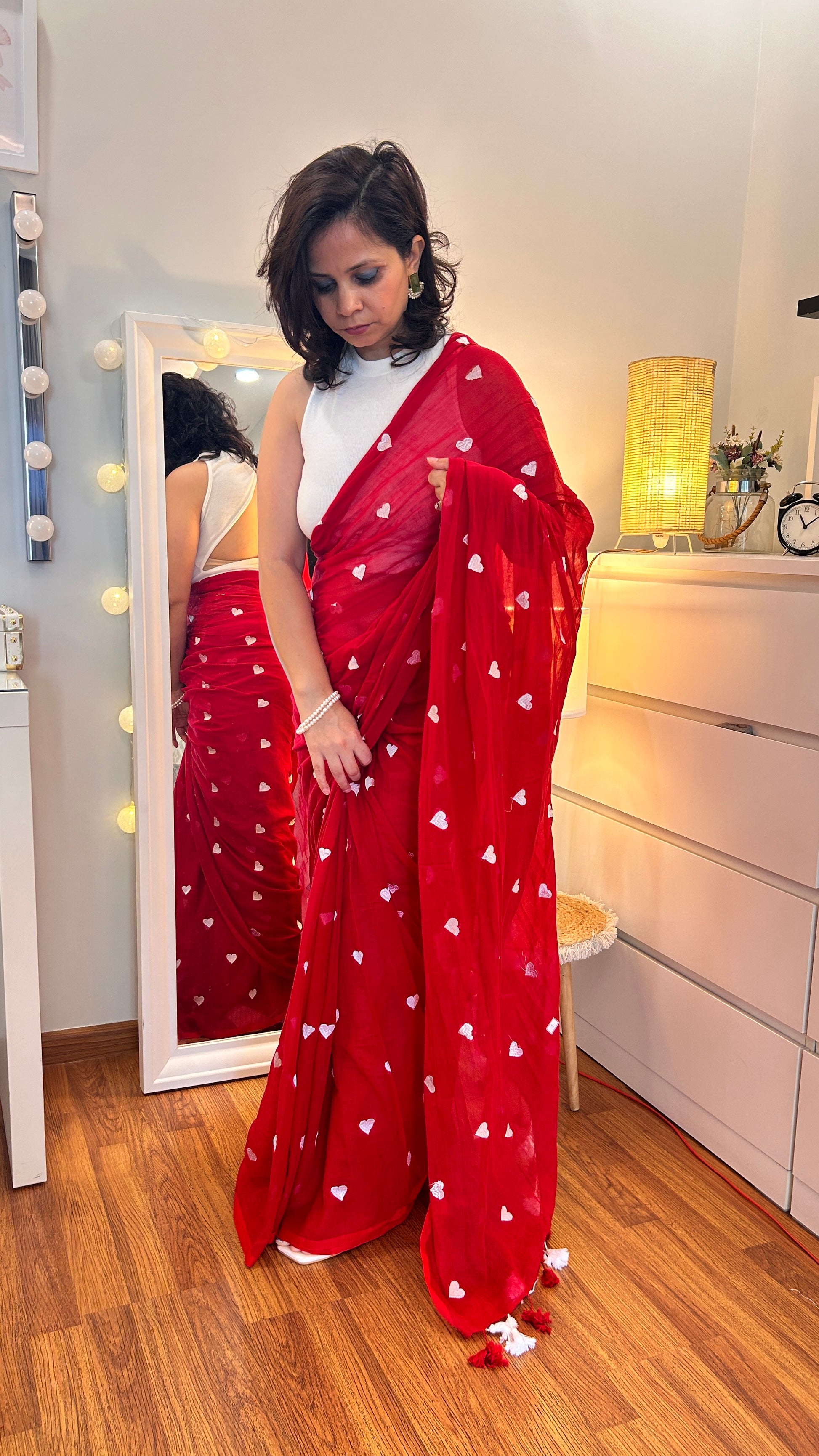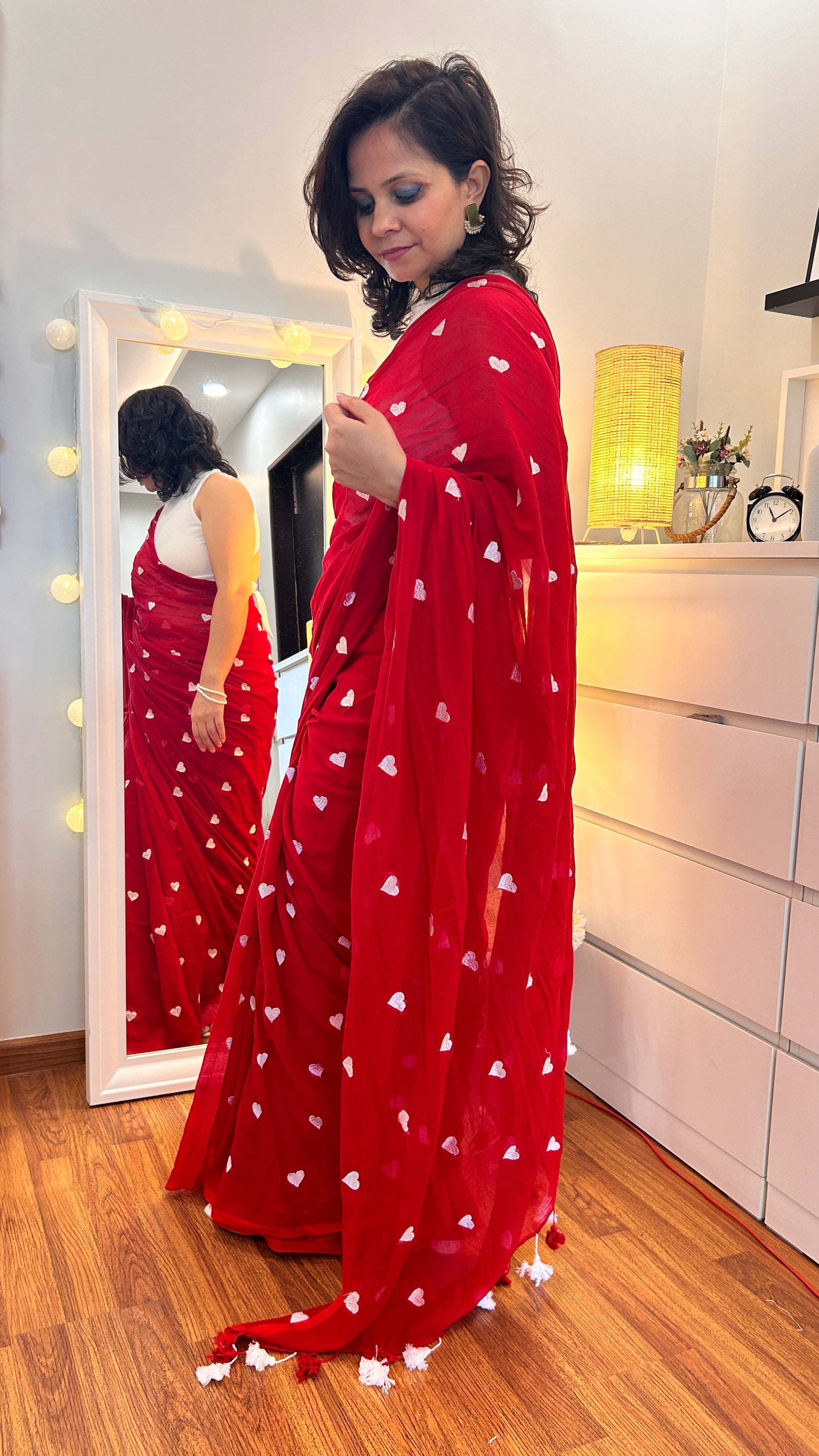 Add a touch of chic and quirky flair with our vibrant mul cotton saree, adorned with playful small heart motifs throughout. This eye-catching design combines bold colors with whimsical patterns, making it the perfect choice for those who love to stand out. Crafted from lightweight mul cotton, it ensures comfort and ease while draping elegantly. Ideal for adding a touch of fun and flair to both casual outings and festive events.