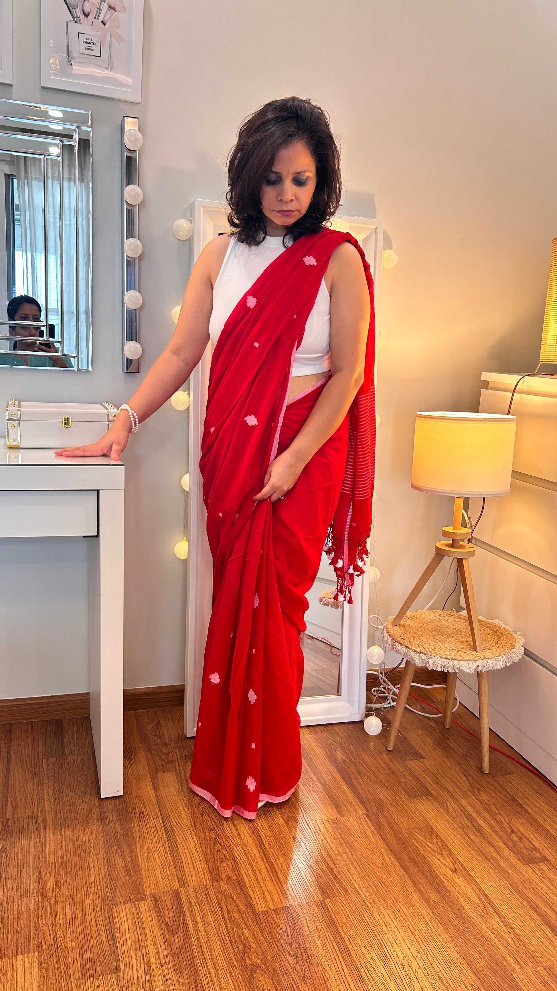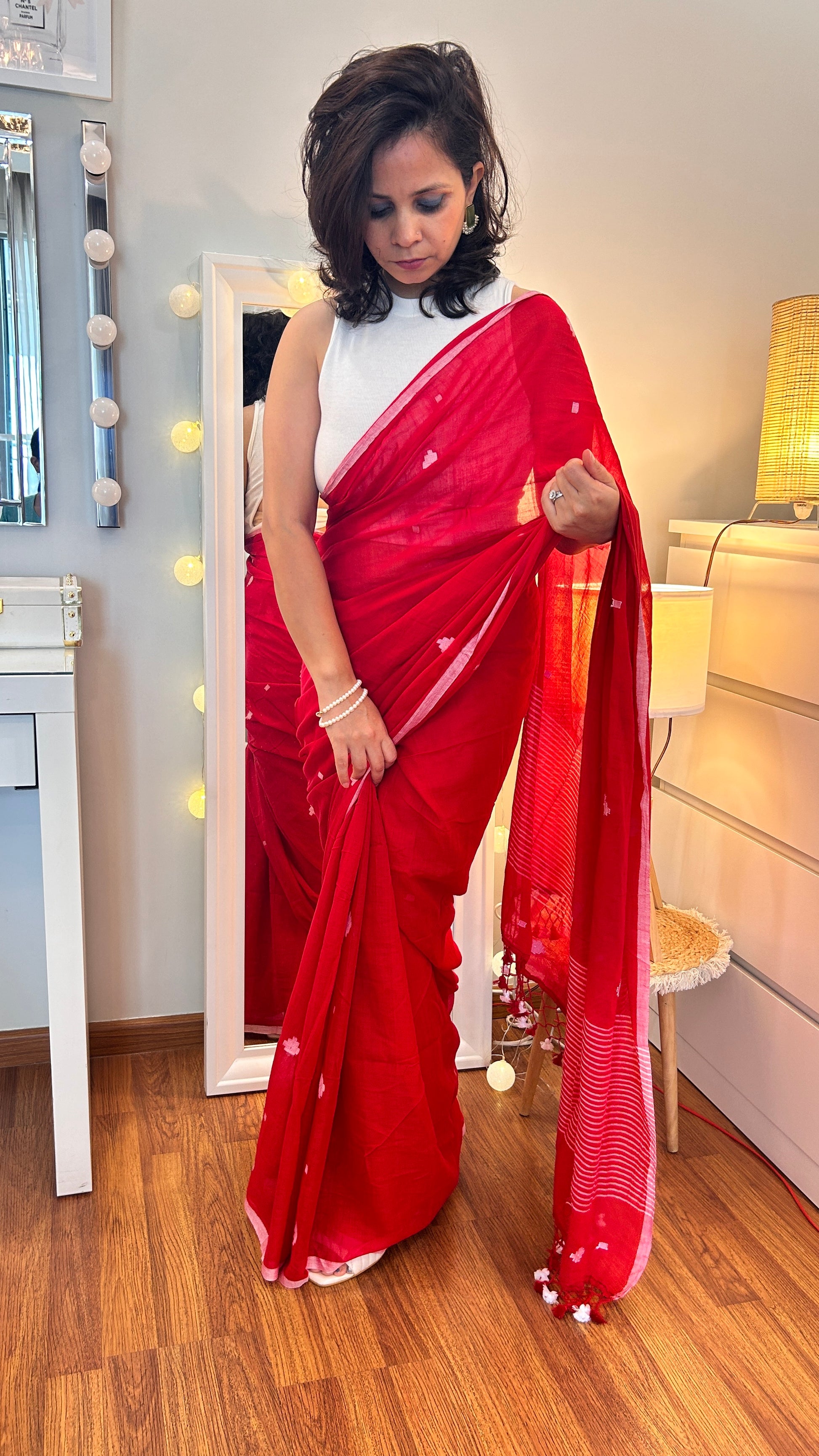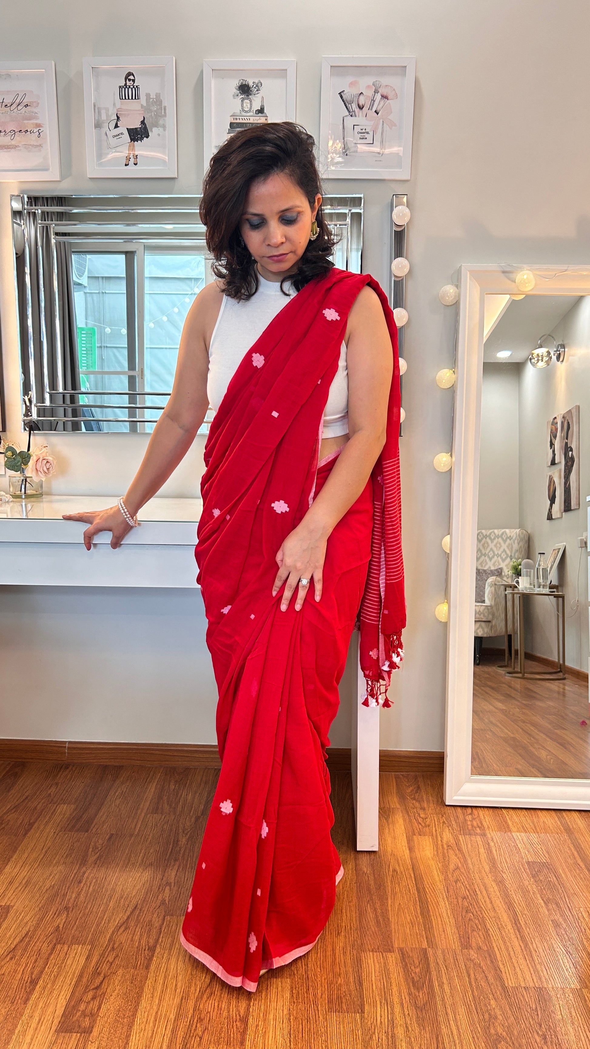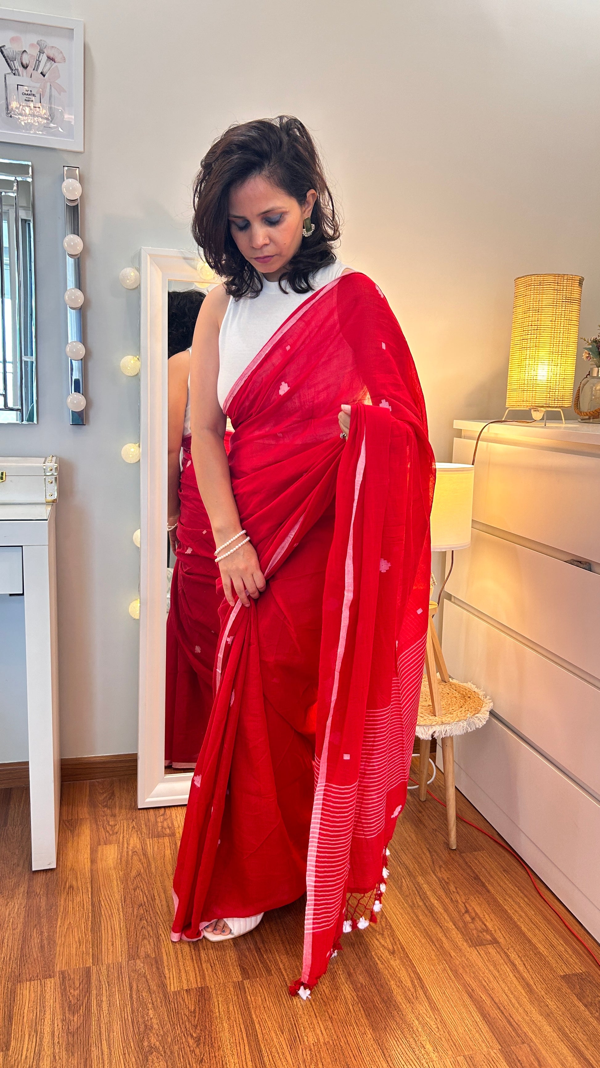 Celebrate tradition with our Jamdani Ruby Radiance Saree, featuring exquisite sarees woven with intricate patterns and motifs. Made from fine cotton, these lightweight sarees offer a beautiful drape and vibrant colors, perfect for any occasion. This saree is a work of art, celebrating the beauty of tradition in modern fashion.