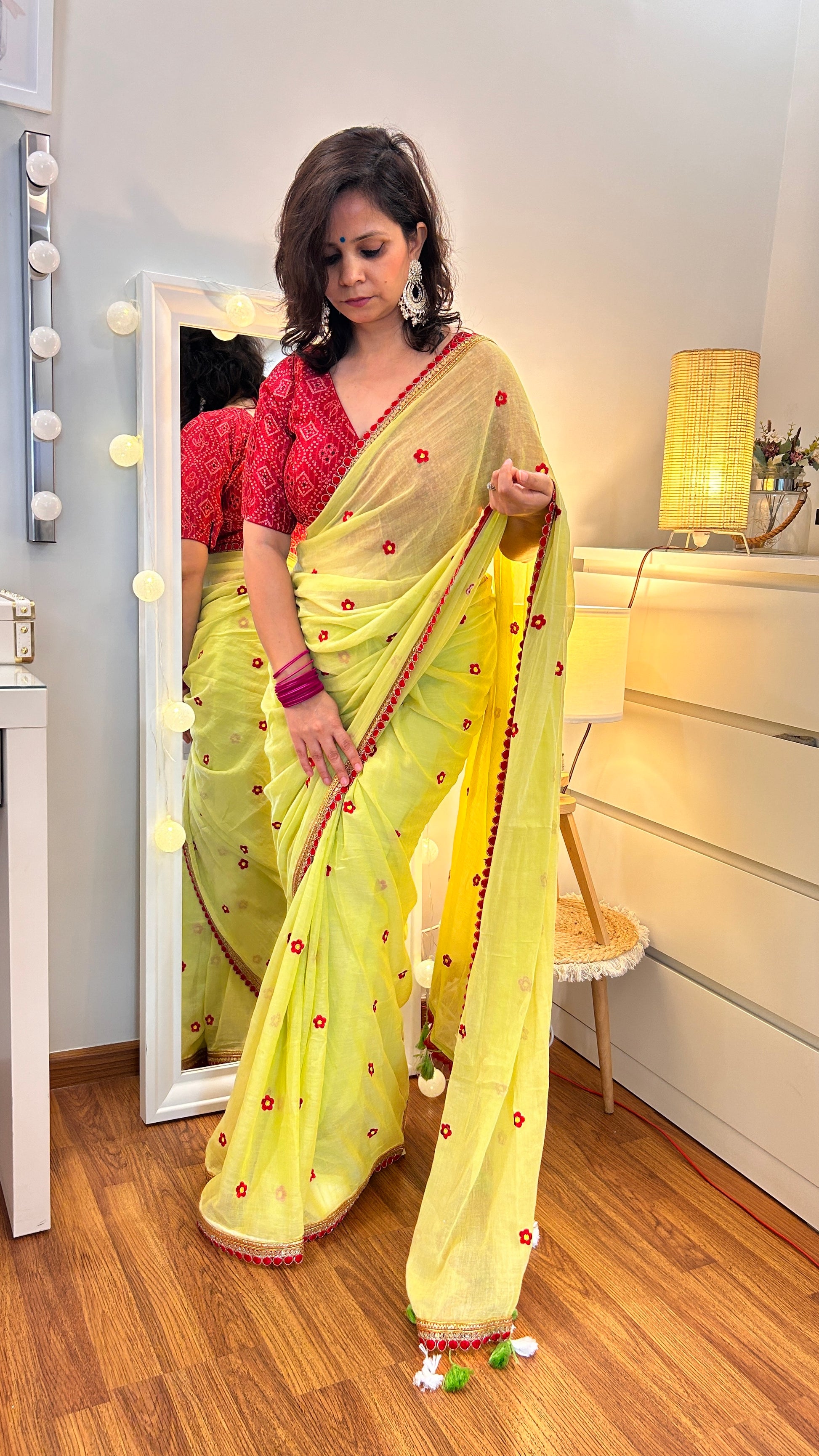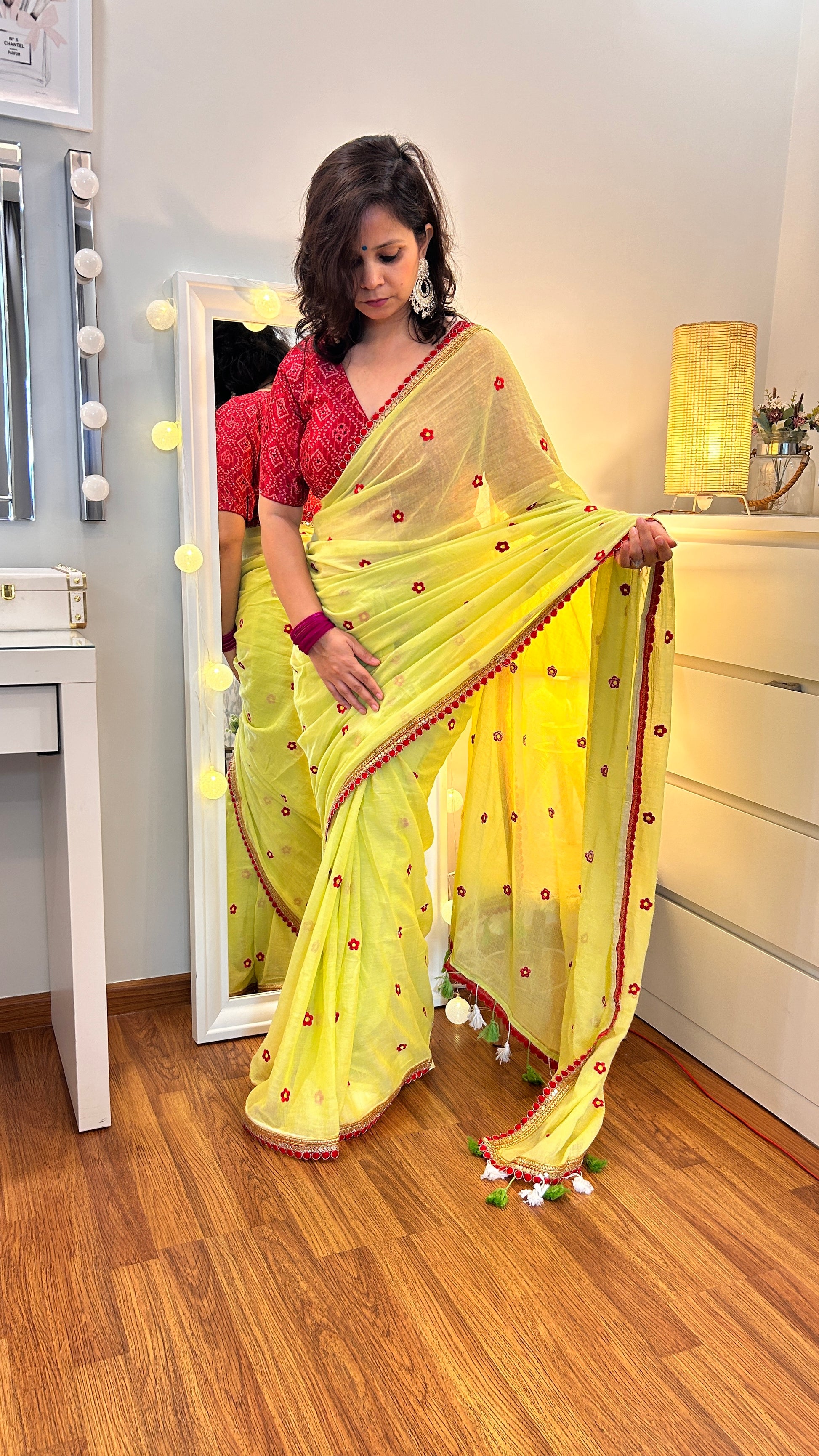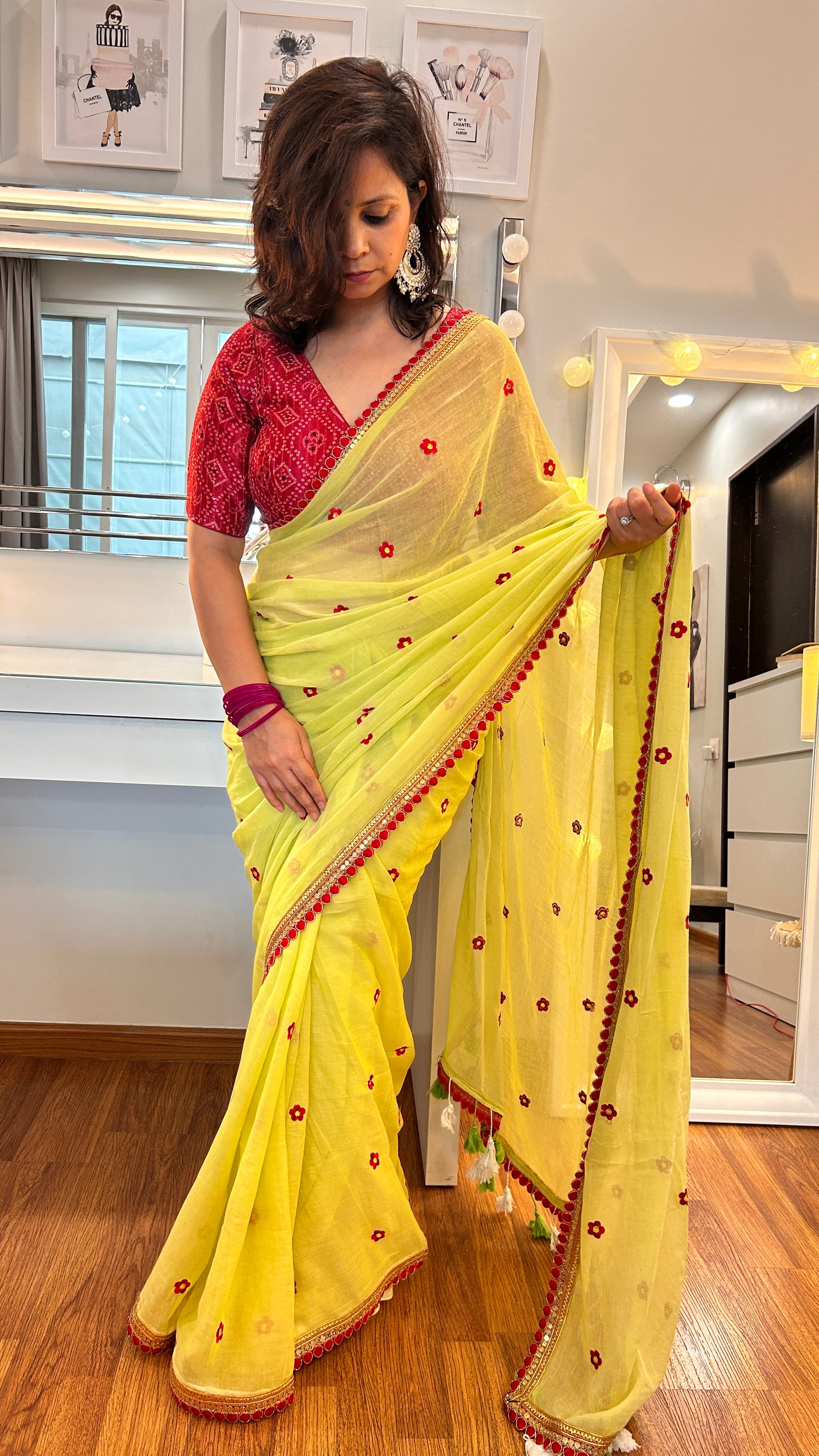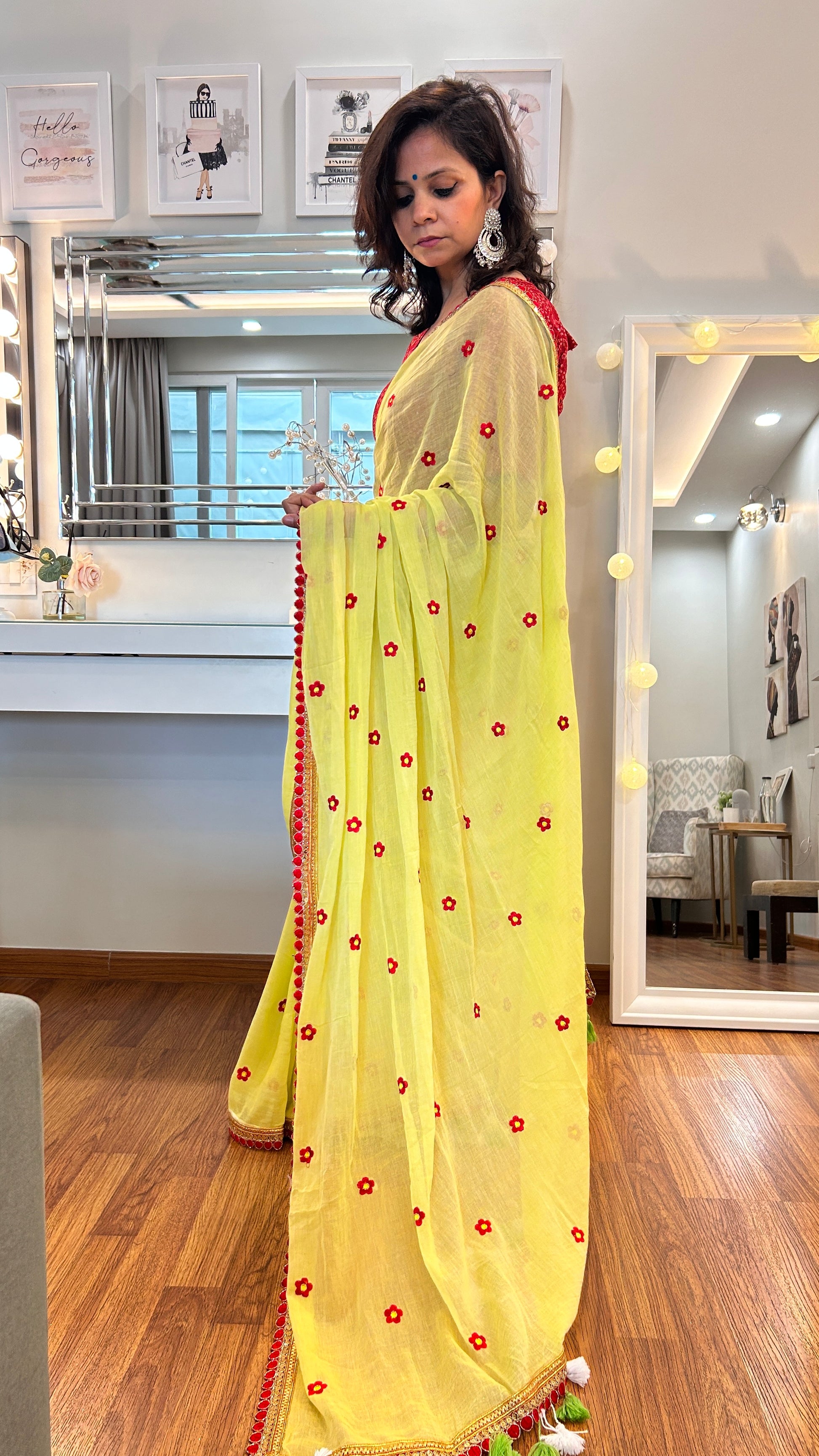 Unveil your elegance with our enchanting Mul Cotton Floral Lace Mirage Sarees! This stunning piece features intricate floral patterns that dance across the fabric, complemented by delicate golden lace for a touch of glamour. Perfect for festive occasions or casual gatherings, it combines comfort with timeless beauty. Wrap yourself in this lightweight masterpiece that embodies the essence of traditional craftsmanship—your wardrobe's new statement piece awaits!