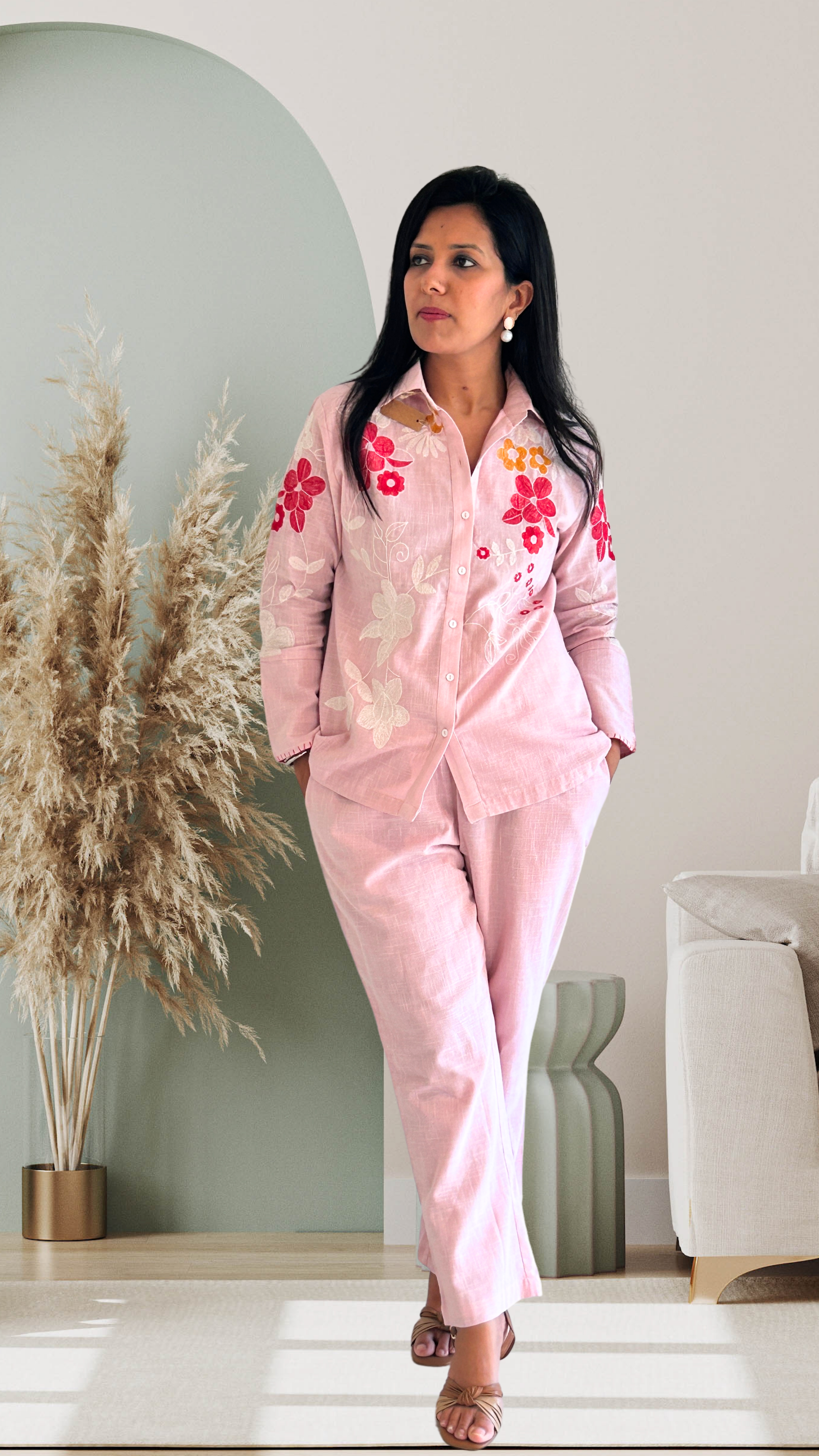 This baby pink coord set blends delicate charm with a striking twist — featuring bold embroidery on the shirt for that perfect balance of elegance and edge. Effortlessly chic, made to stand out!