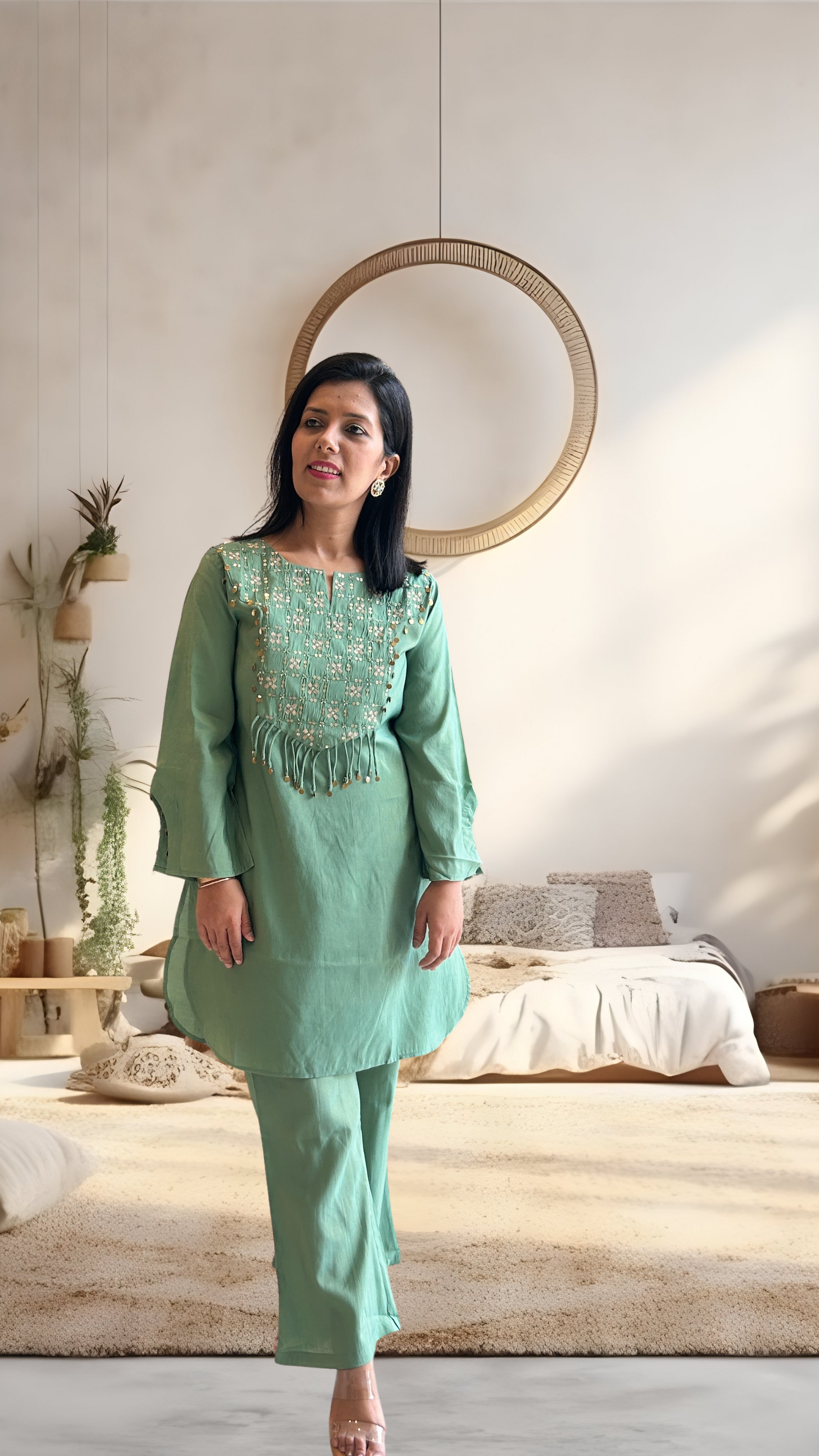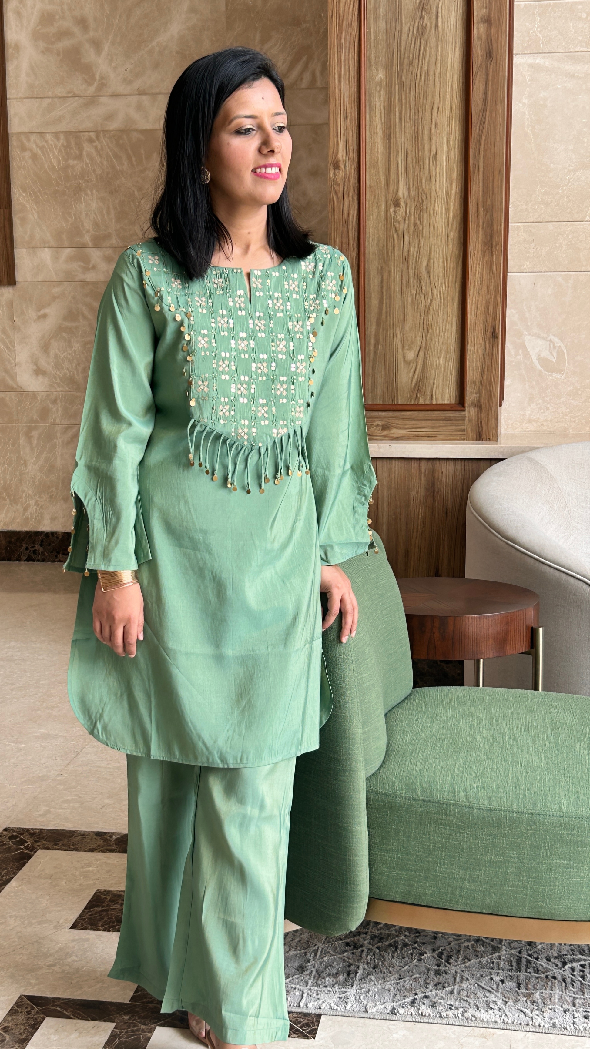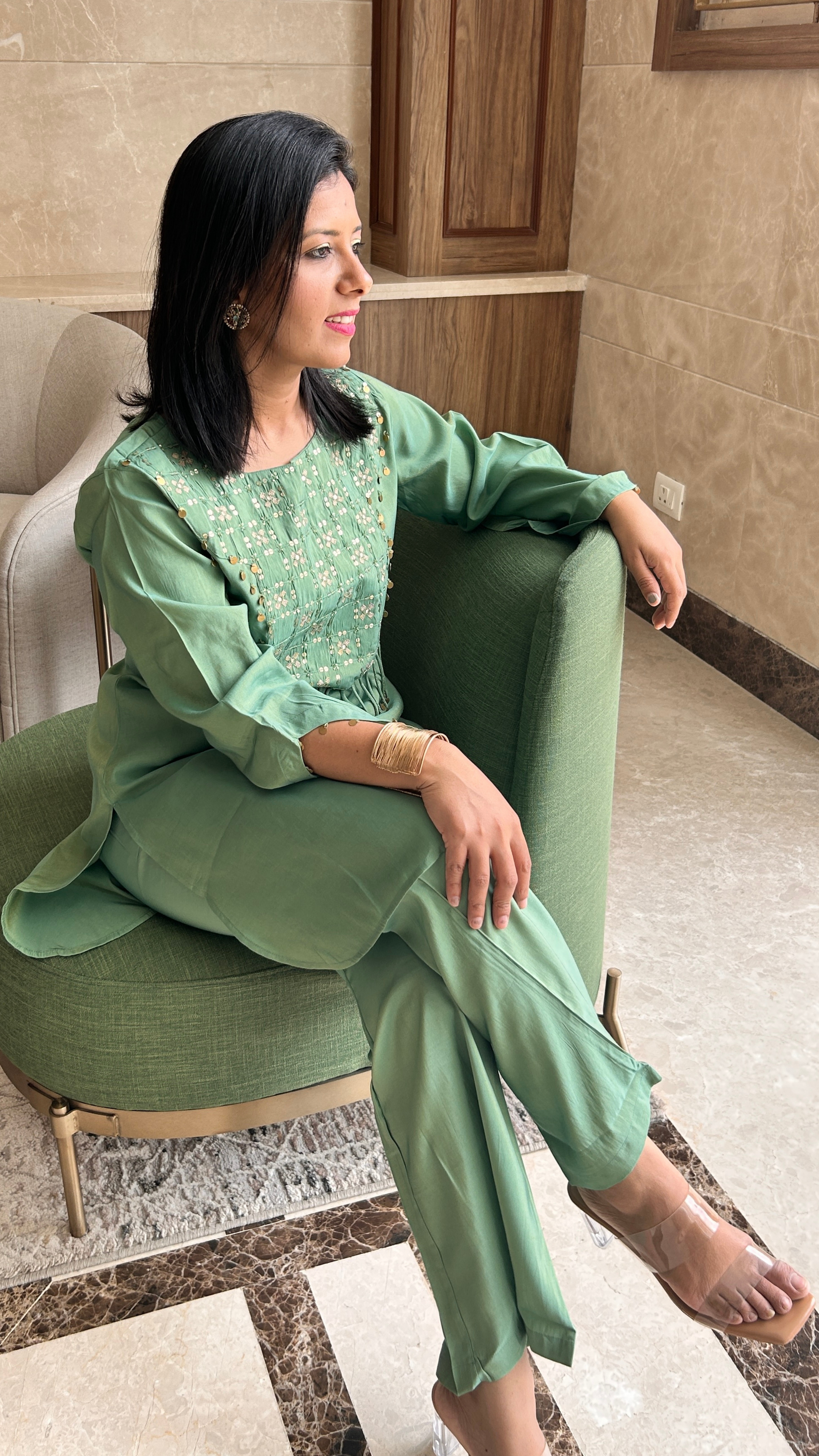 Turn heads in this striking green sequin co-ord set—where bold shimmer meets effortless style. Perfect for cocktail nights, festive glam, or when you're ready to outshine the ordinary.