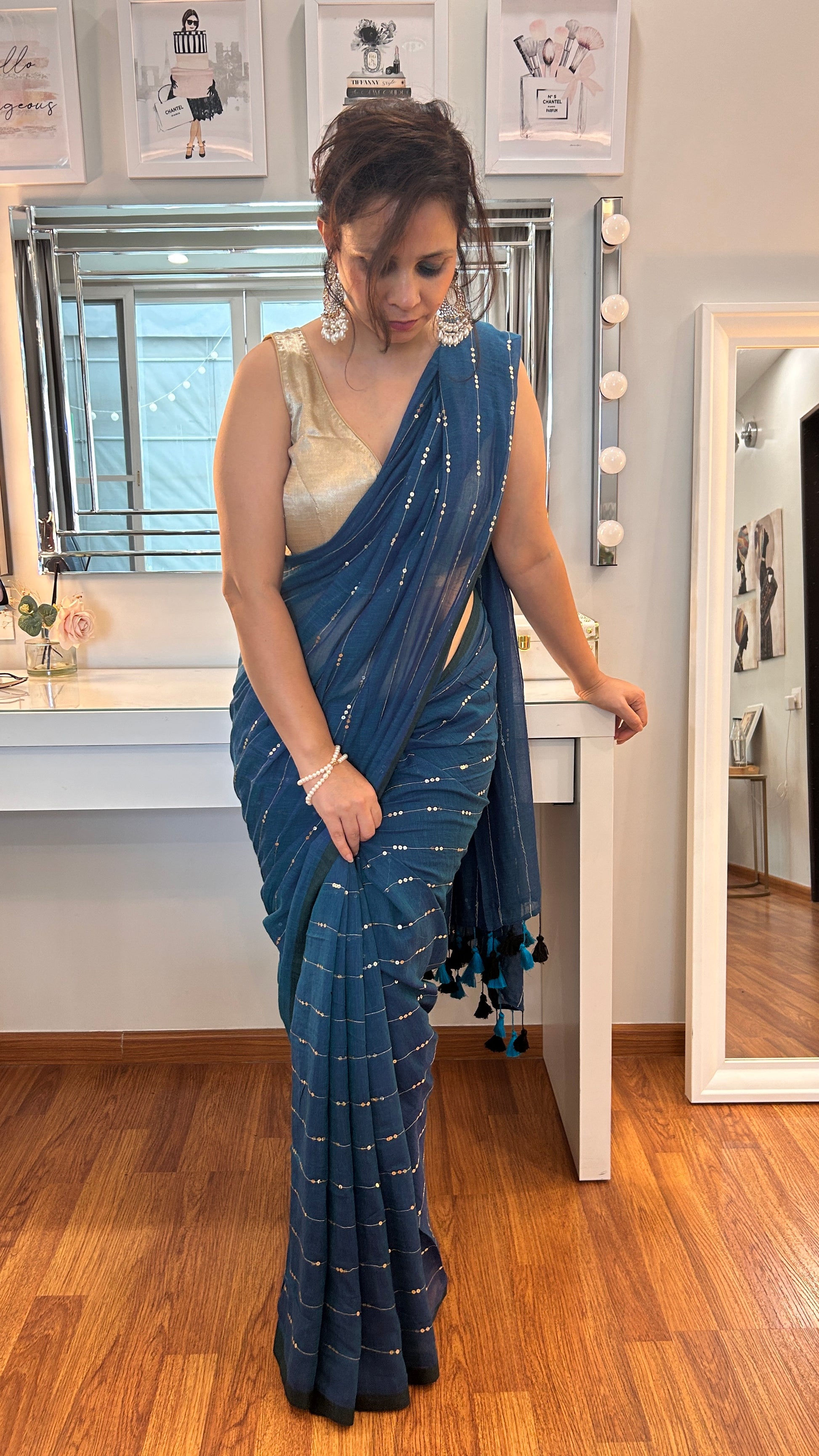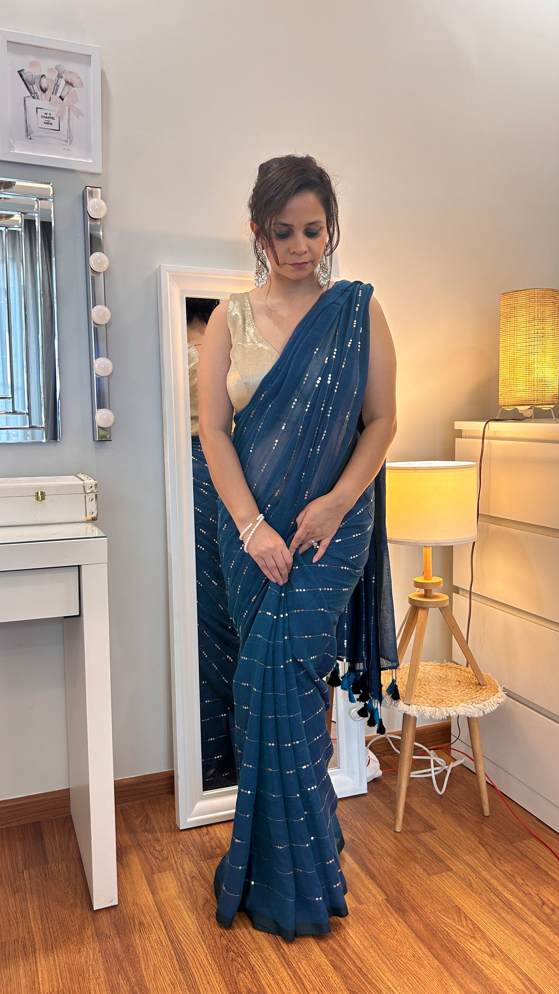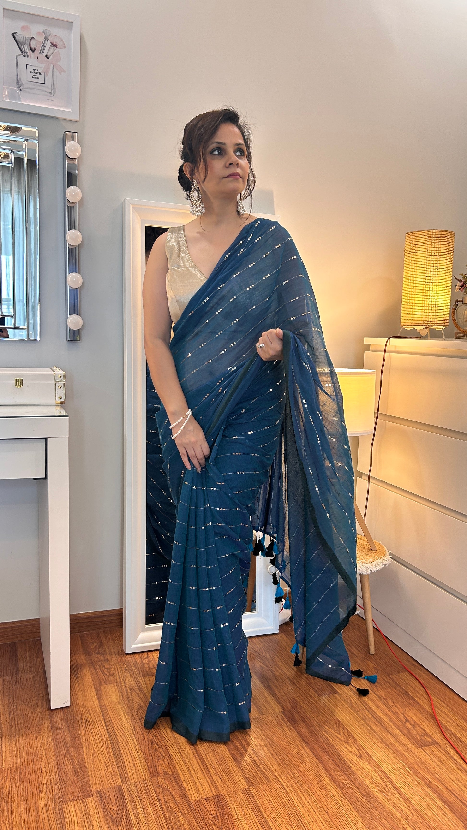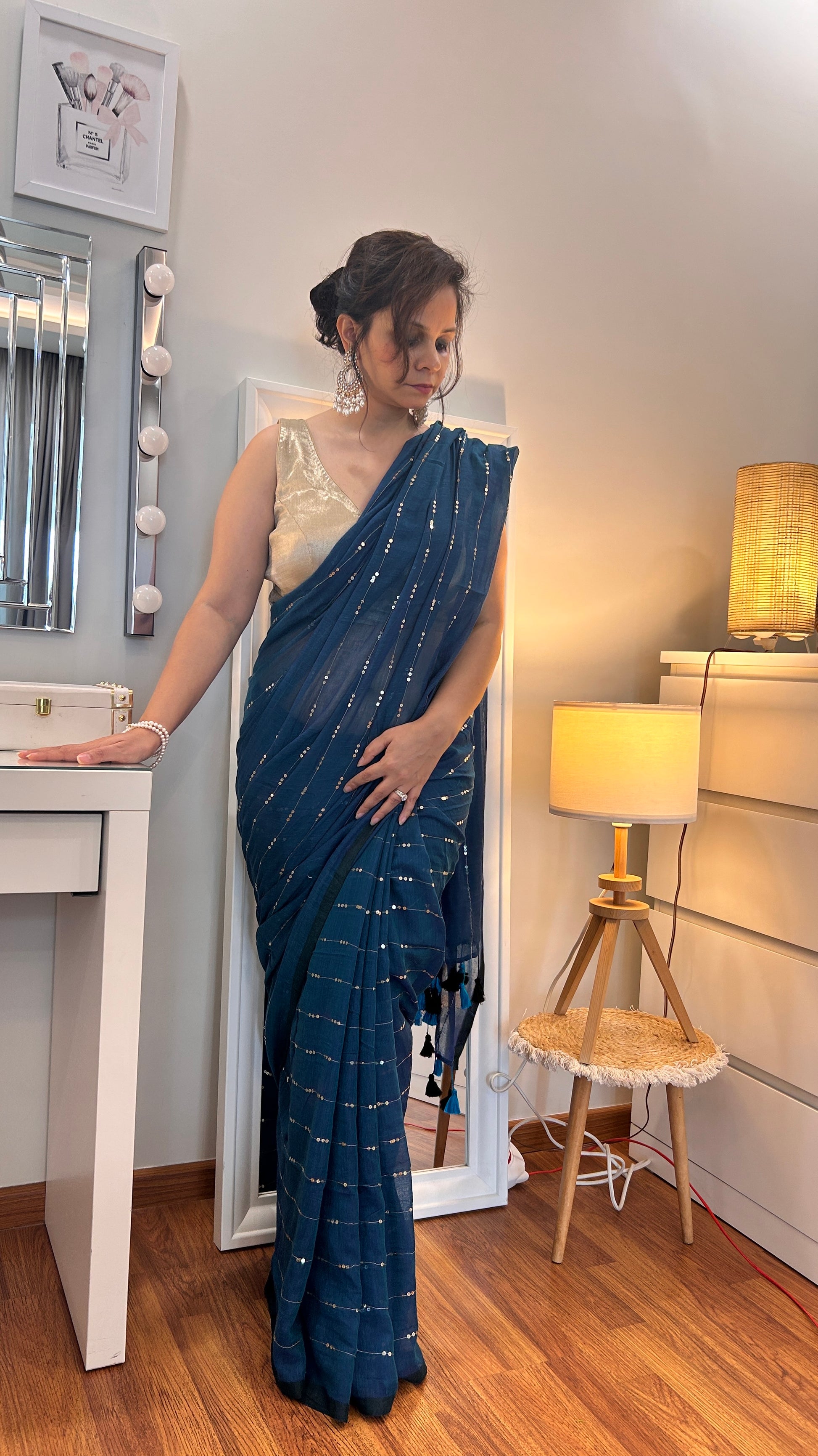 Embrace the allure of the night with our Teal Glimmer Saree, adorned with shimmering sequins that catch the light with every movement. This exquisite piece combines deep, rich hues with intricate detailing, making it perfect for any elegant occasion. Effortlessly drape this saree for a timeless look that exudes charm.