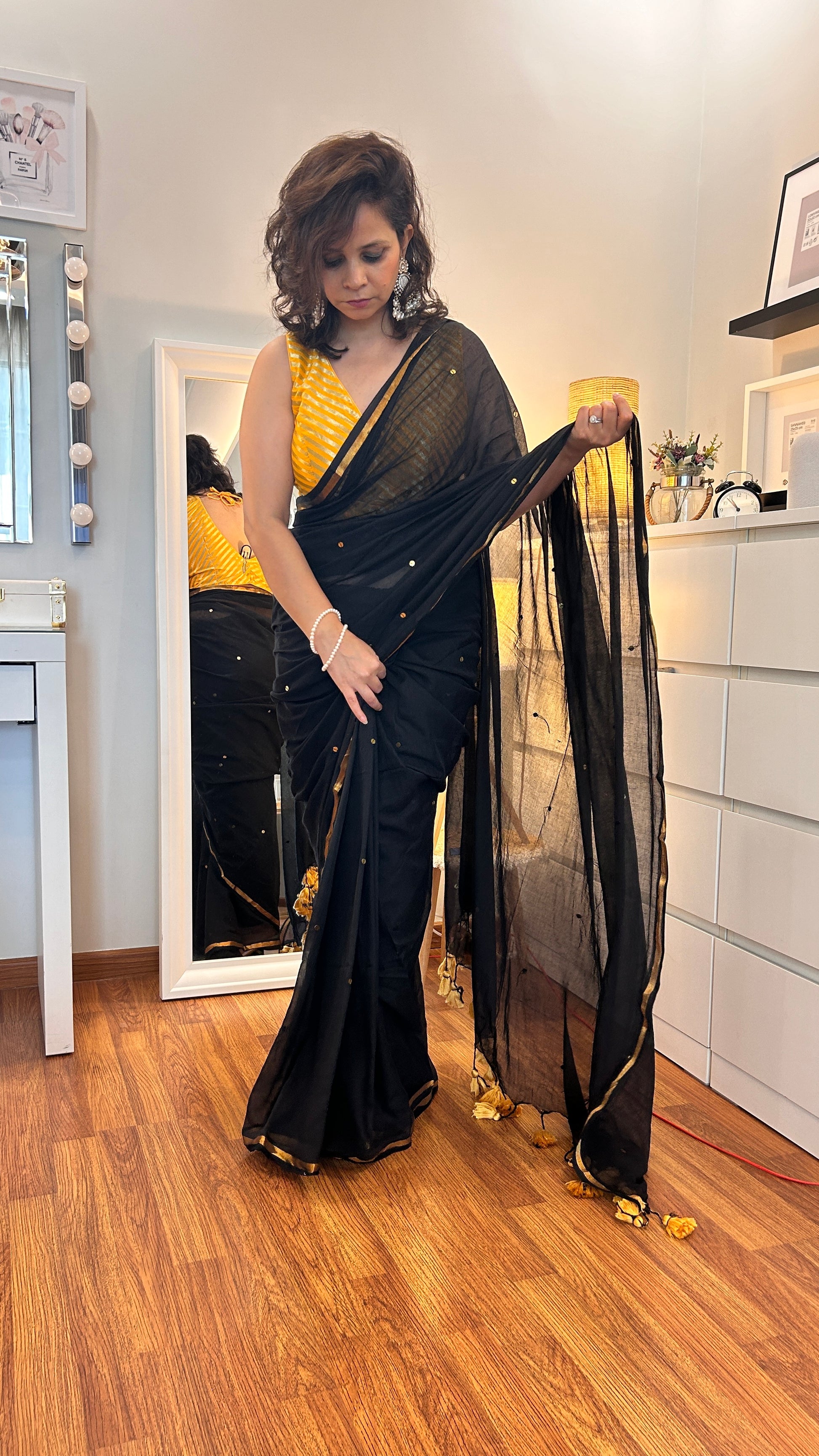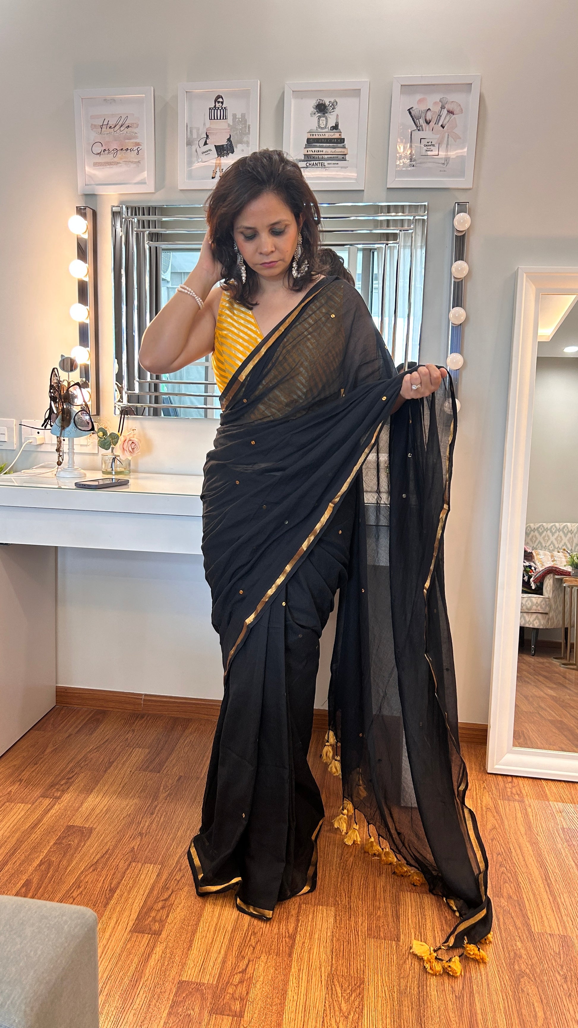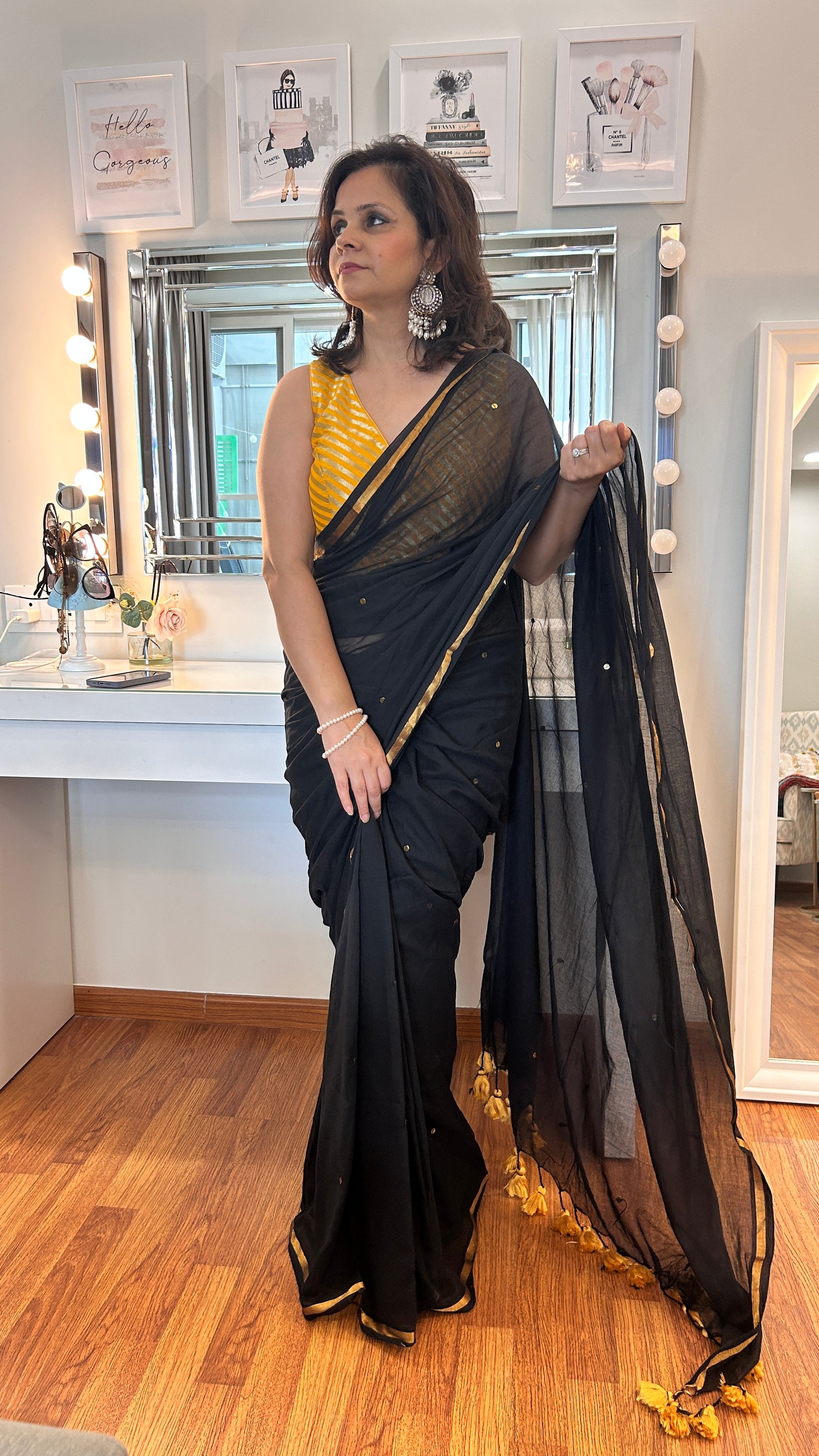 Make a statement with this stunning saree, beautifully embellished with delicate gold dots. The intricate detailing adds just the right amount of sparkle, creating a refined look perfect for special occasions. Crafted for both elegance and ease, this saree promises to leave a lasting impression with its timeless charm and luxurious finish.