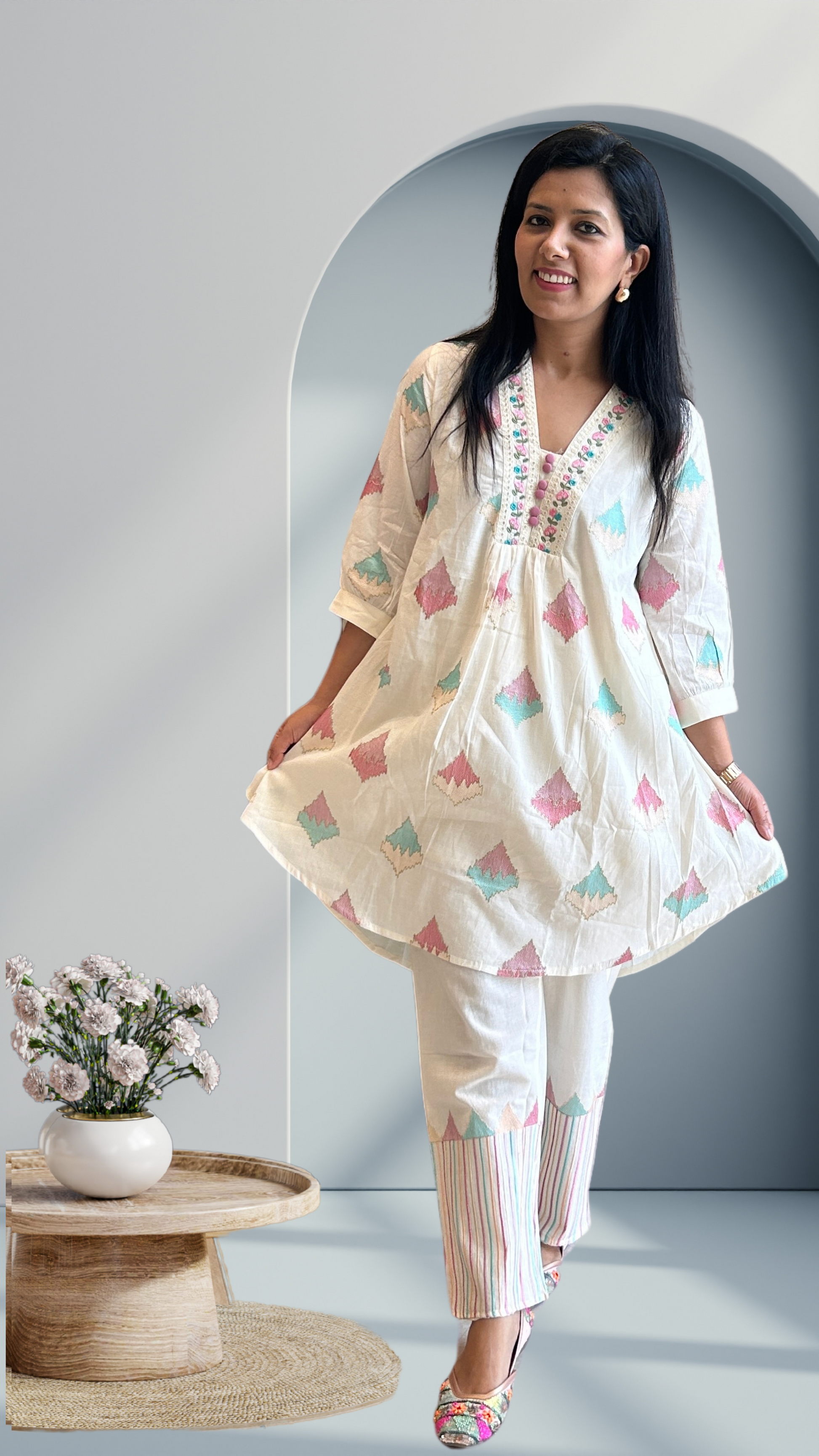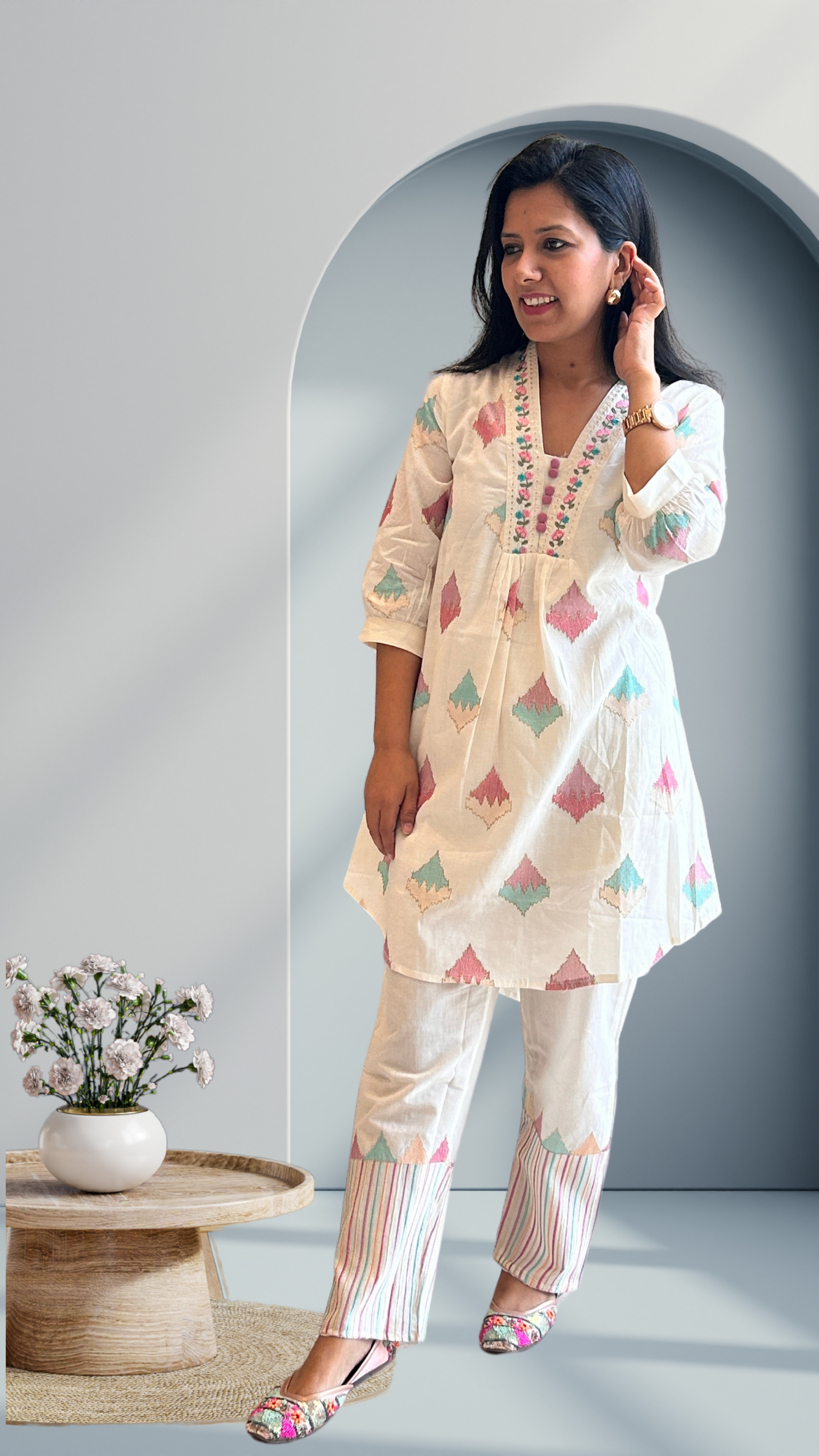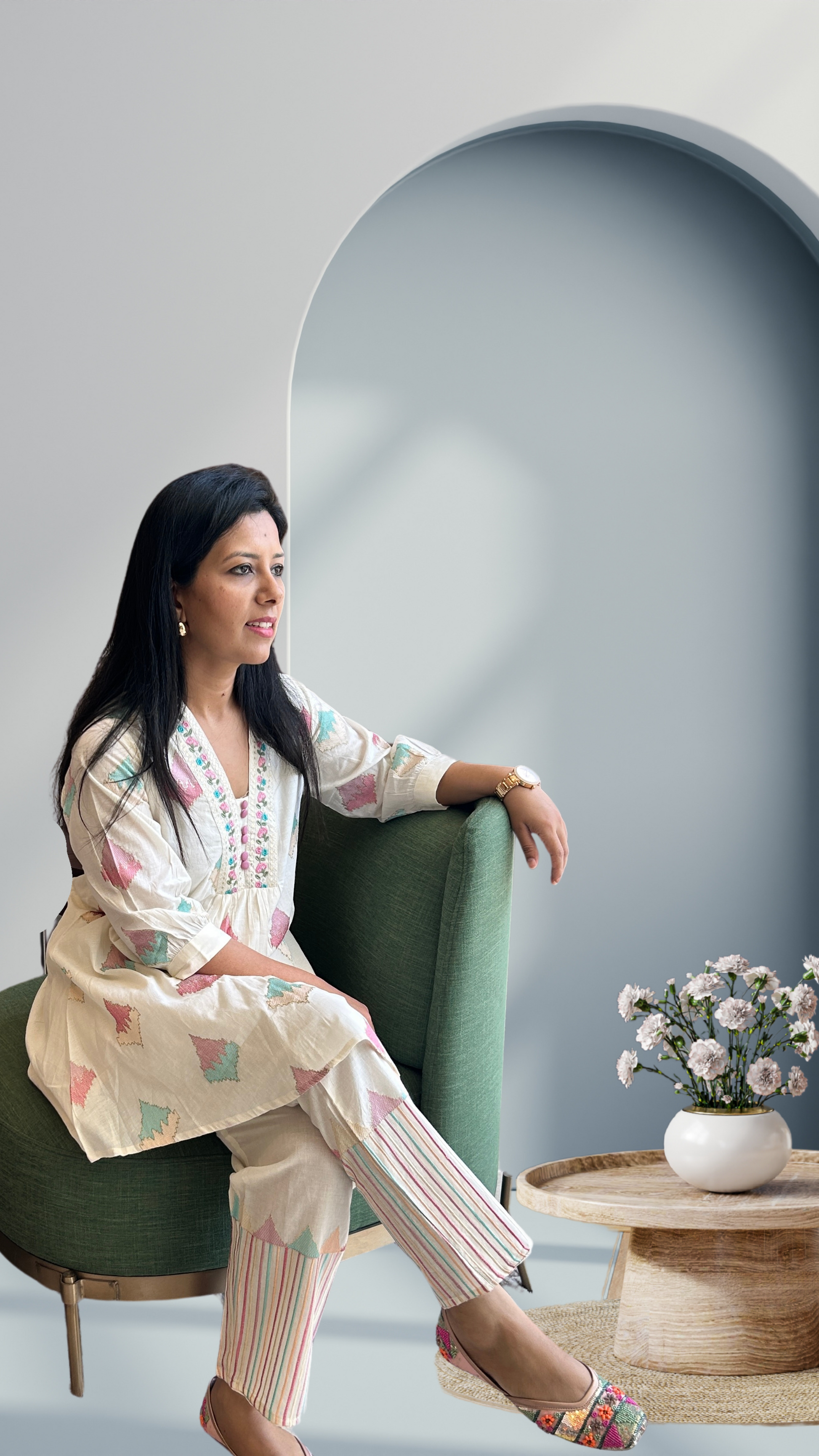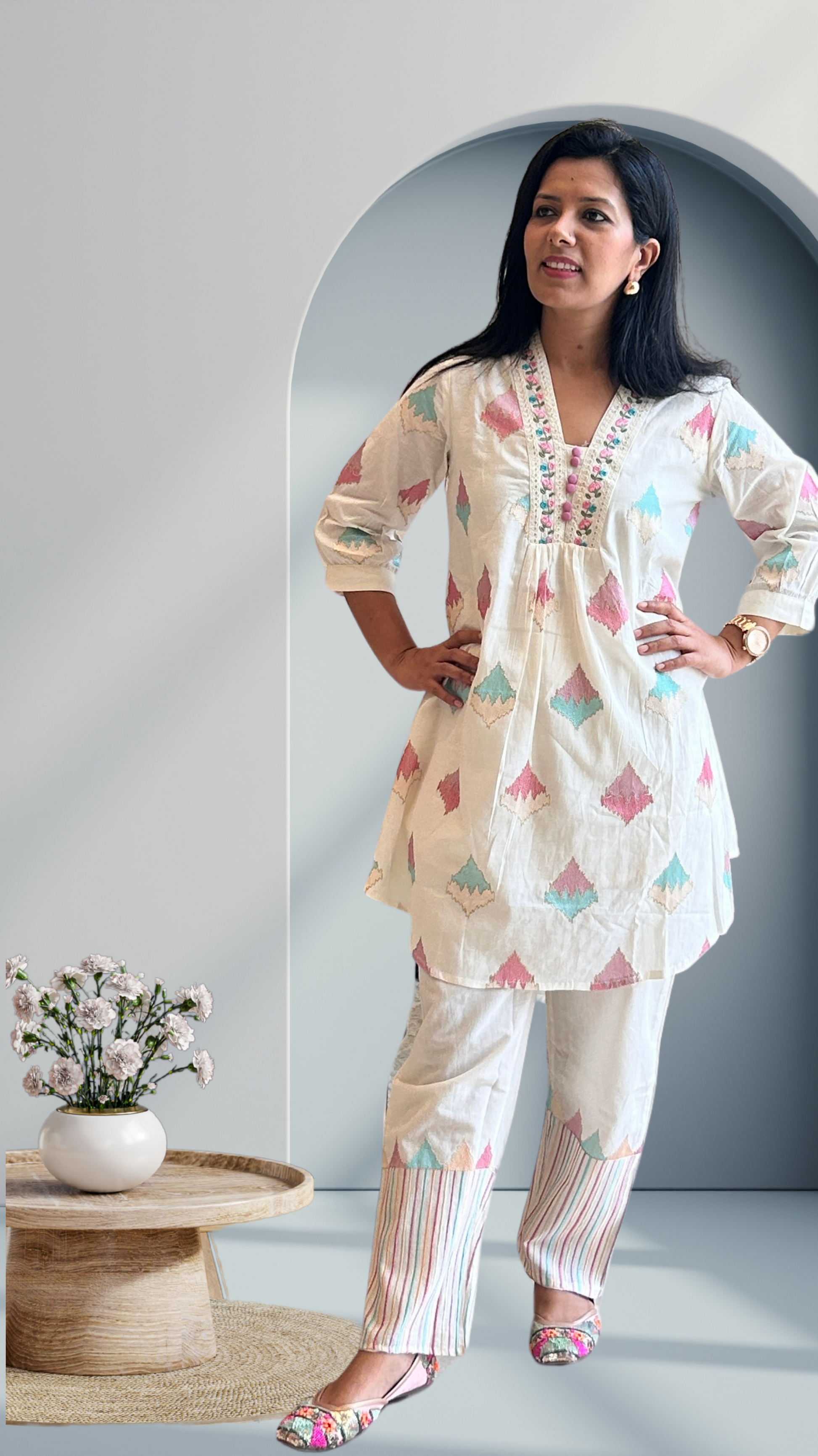 This off-white coord set is elevated with delicate pastel threadwork on the kurta and pants — a perfect blend of subtle charm and effortless elegance. Light, breezy, and beautifully versatile!