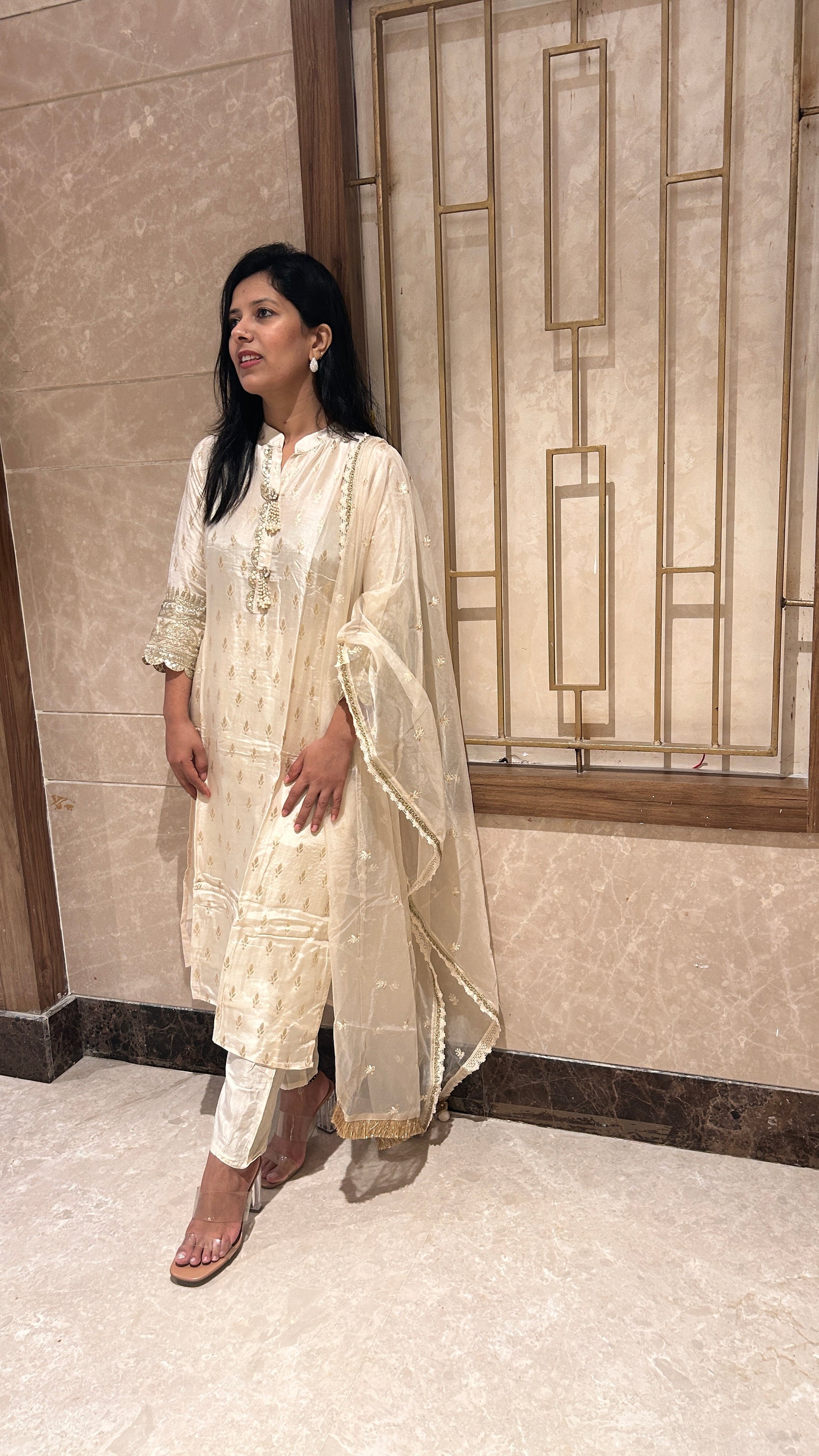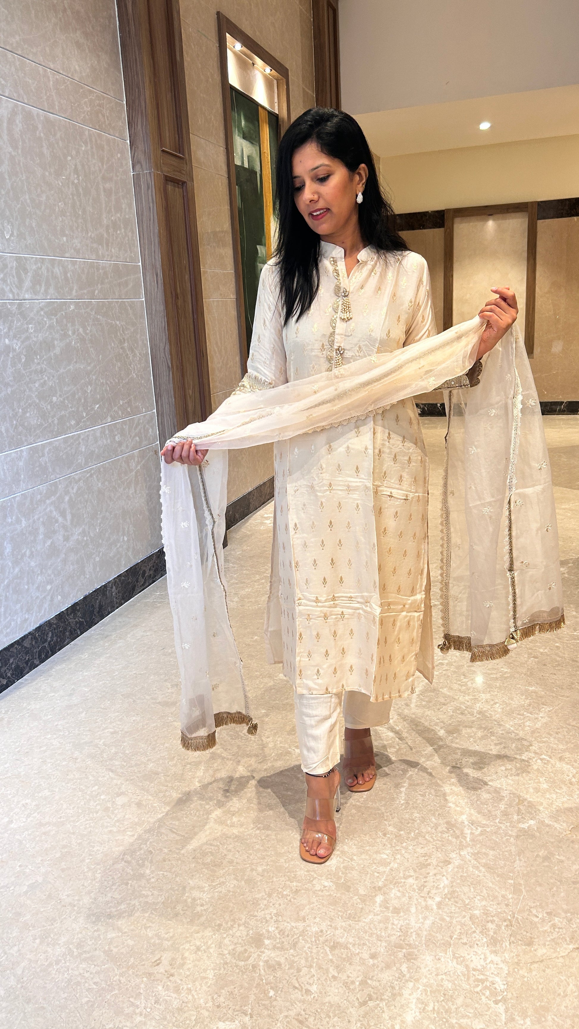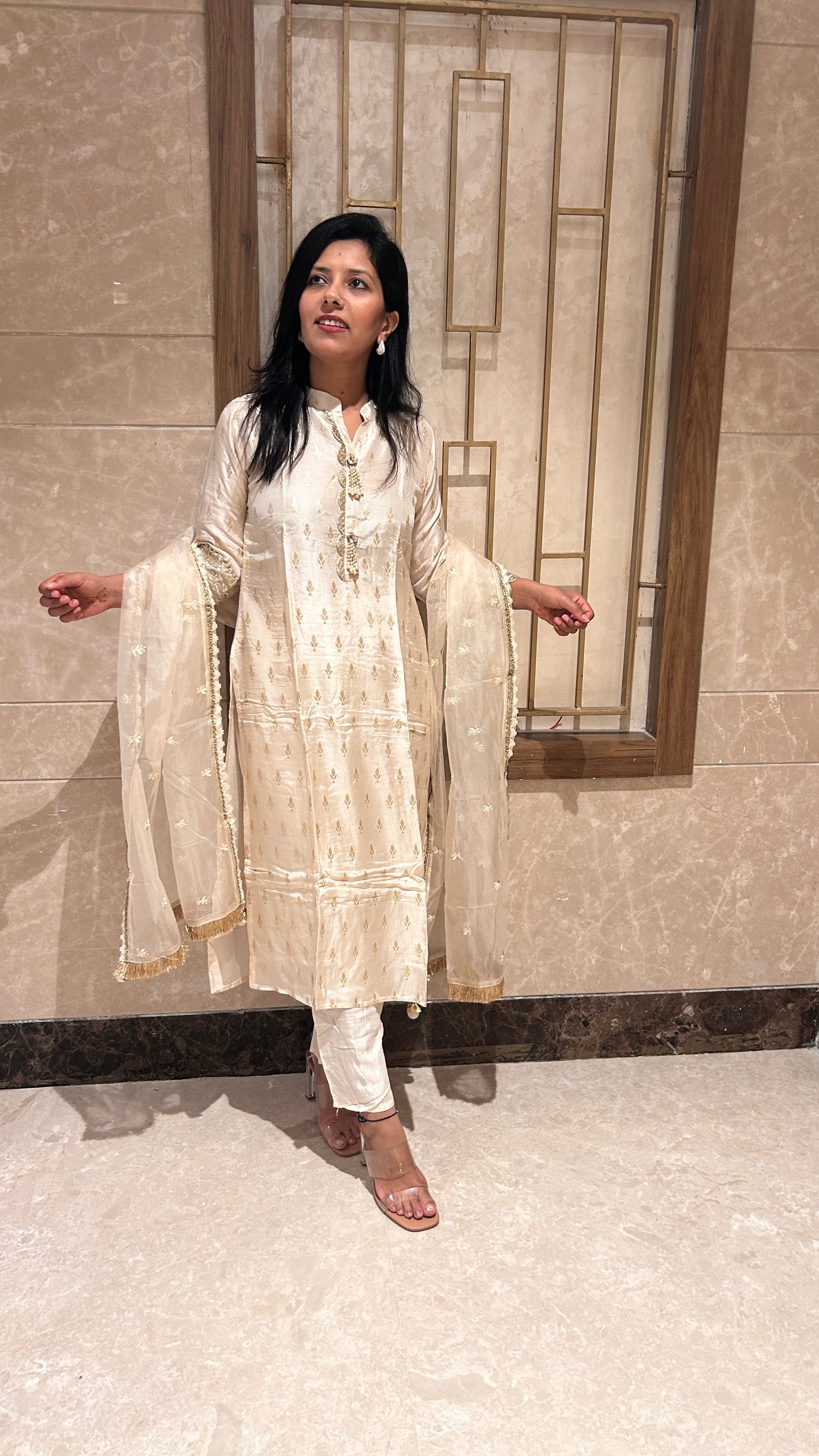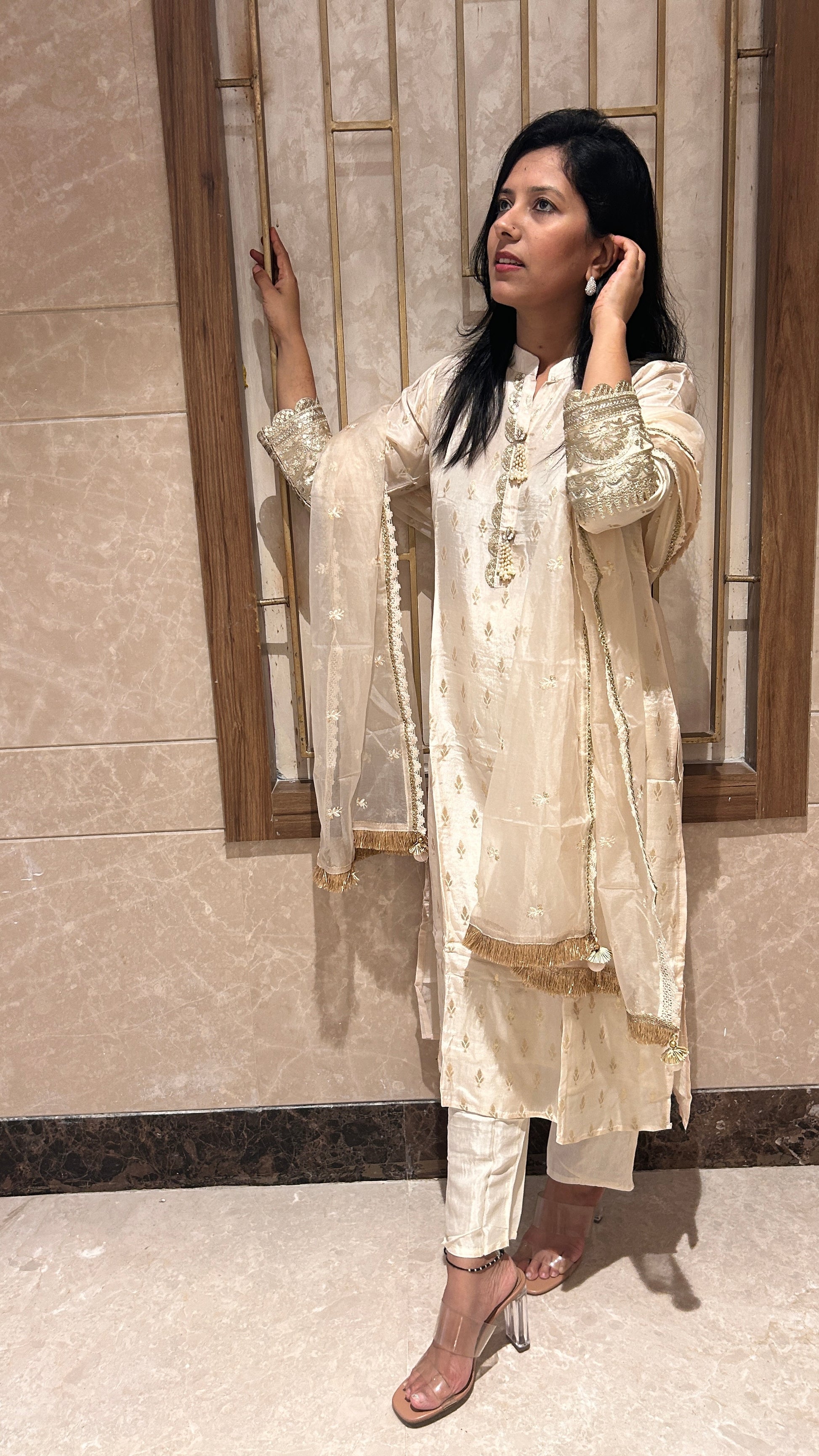 This off-white Banarasi brocade suit captures pure sophistication with its luxurious fabric and intricate zari work. The delicate shimmer of the zari threads weaves beautifully into the fabric, creating a sophisticated interplay of light and texture. Paired with a sheer organza dupatta that adds a soft, ethereal touch, this ensemble exudes a luxurious charm perfect for any occasion. Its understated yet opulent design makes it ideal for those who appreciate classic beauty with a touch of grandeur.