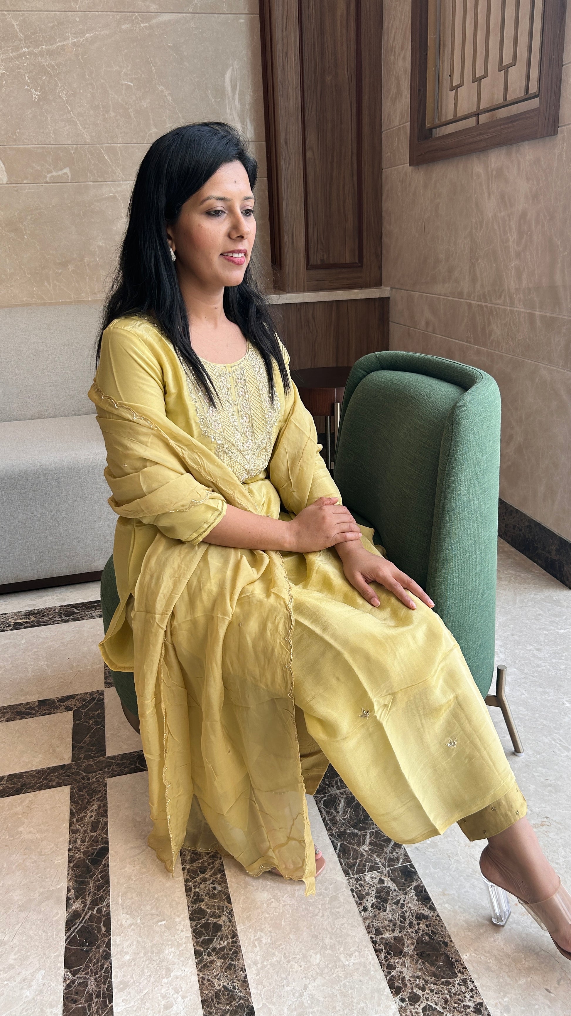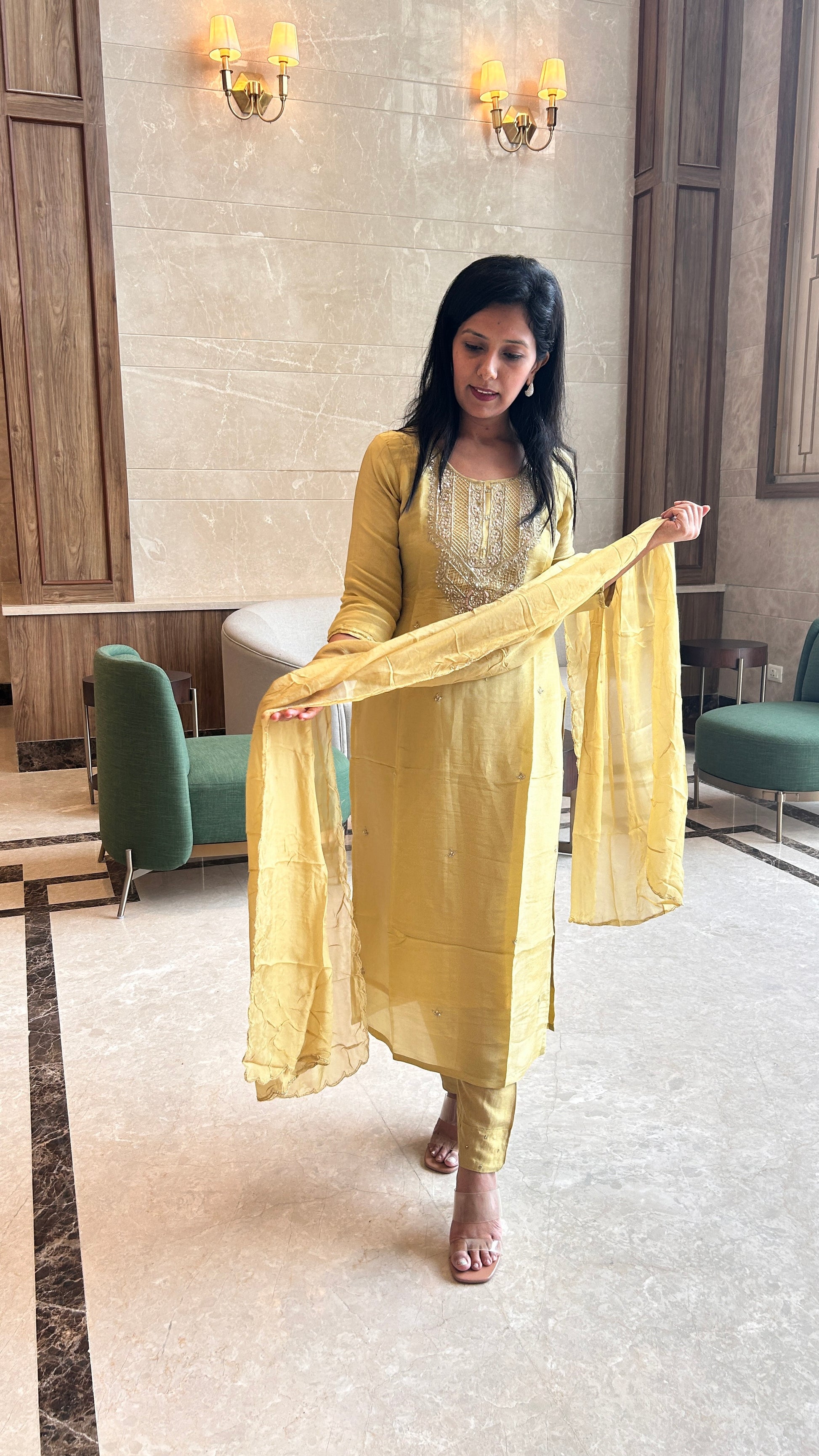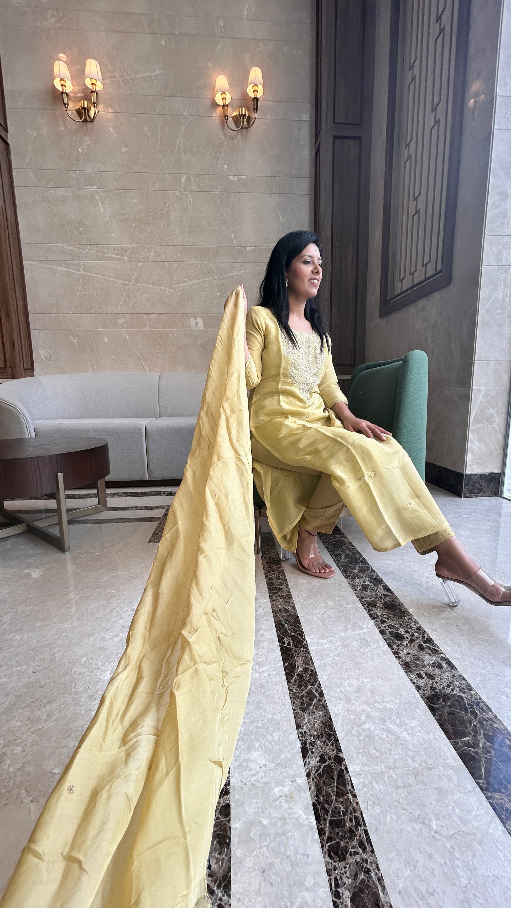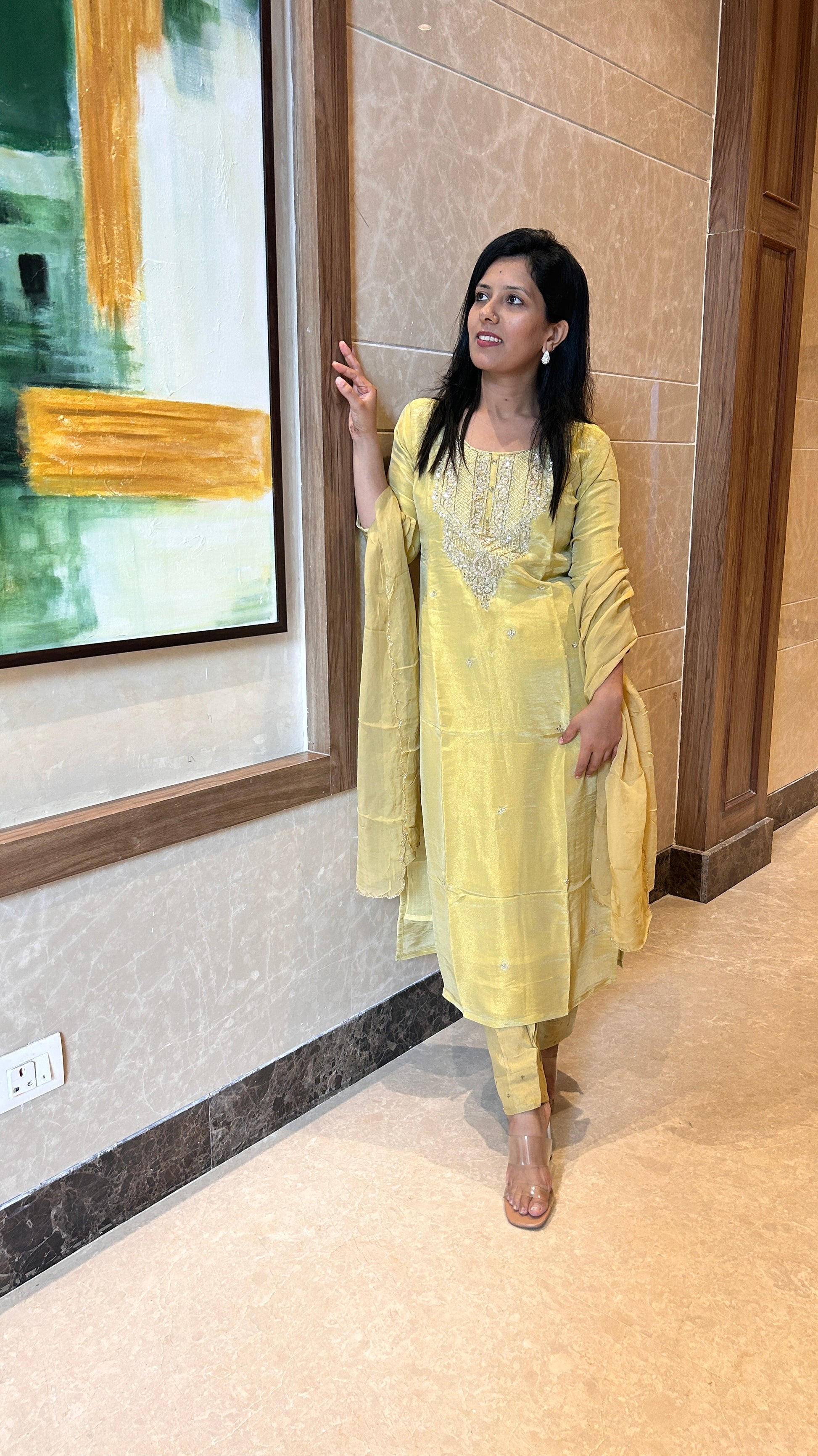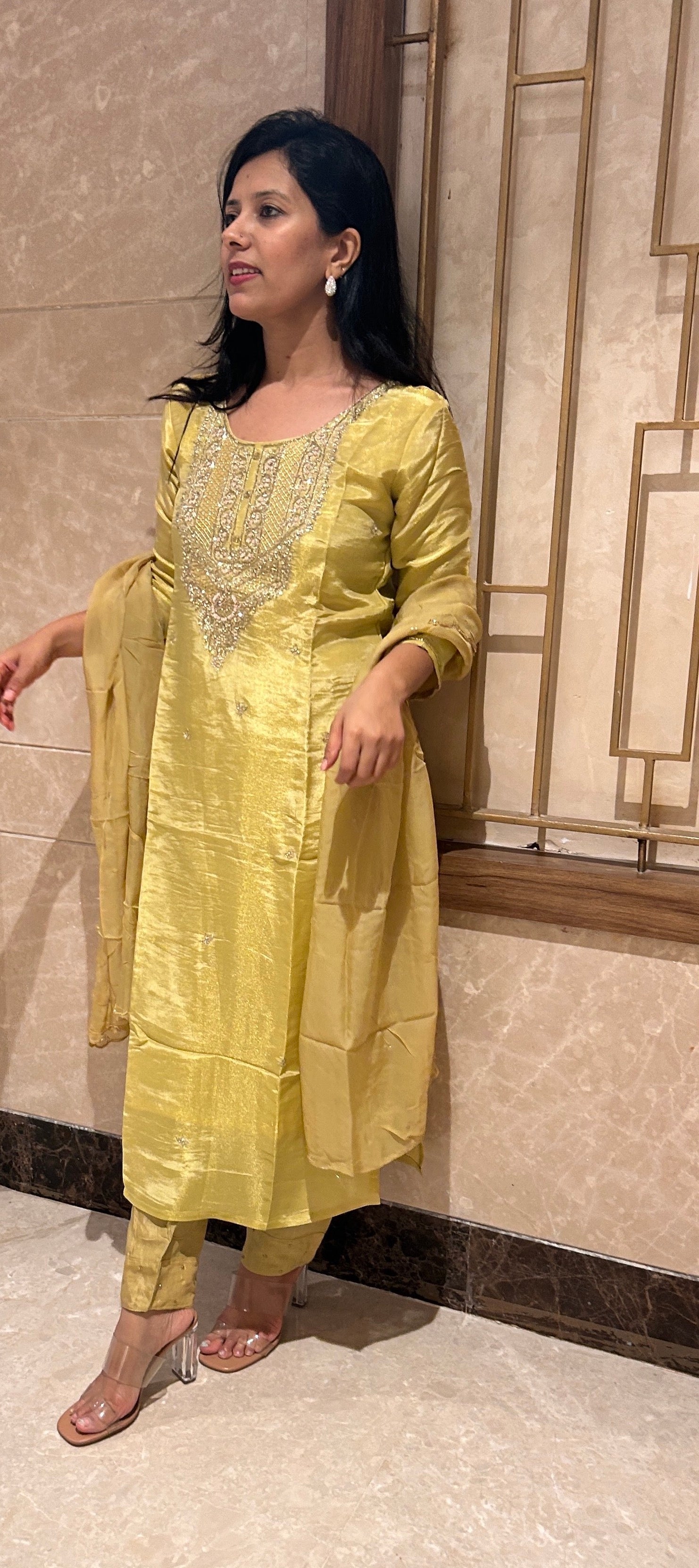 This pastel yellow tissue suit exudes a soft, ethereal charm with its delicate fabric and radiant hue. The exquisite zardozi handwork on the neck and dupatta adds a touch of opulence, transforming this piece into a stunning statement of craftsmanship. The fluidity of the tissue fabric enhances its graceful drape, while the intricate detailing creates a perfect balance of tradition and contemporary elegance. Ideal for festive celebrations or special occasions, this suit offers timeless beauty and refined sophistication.